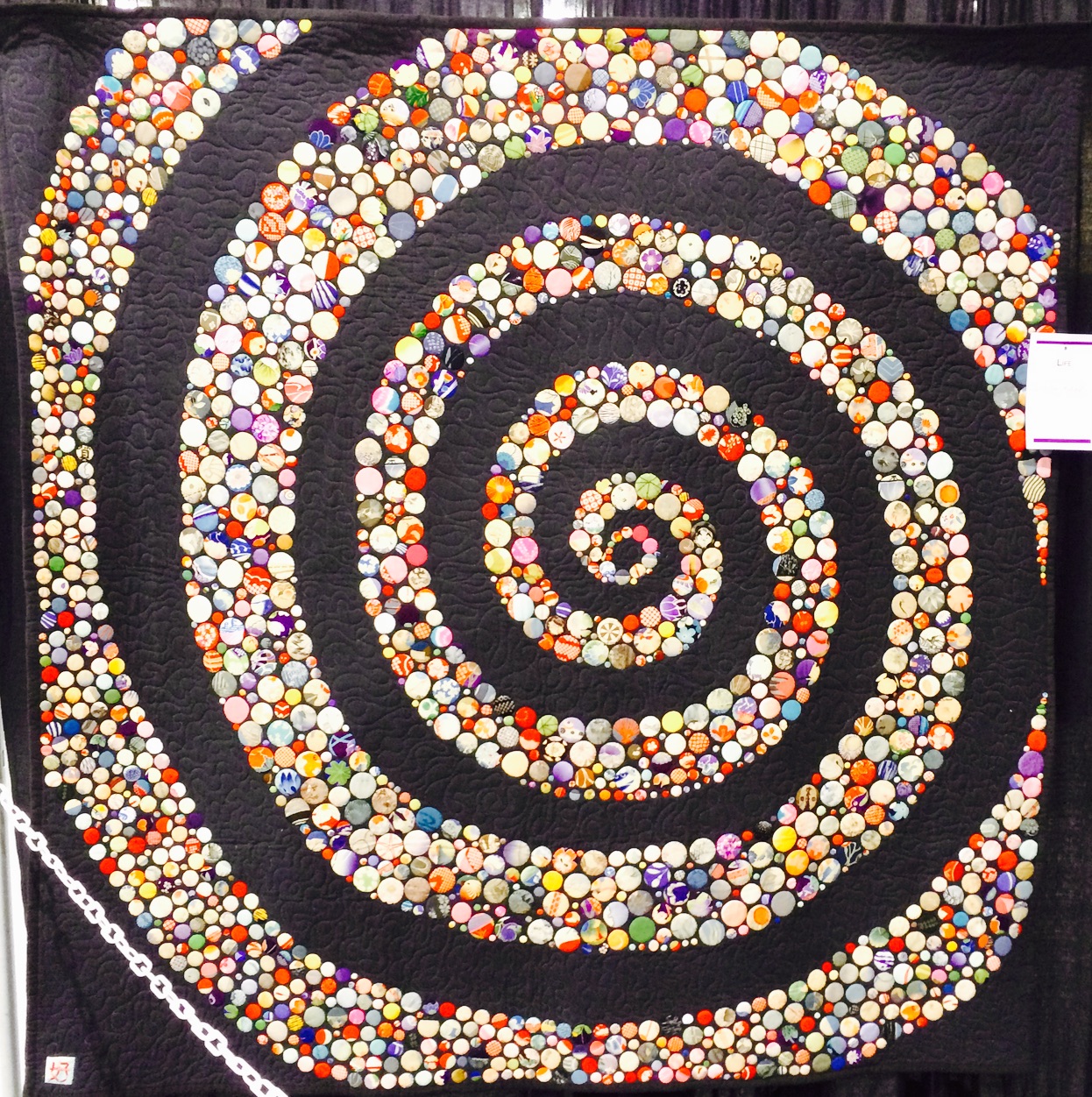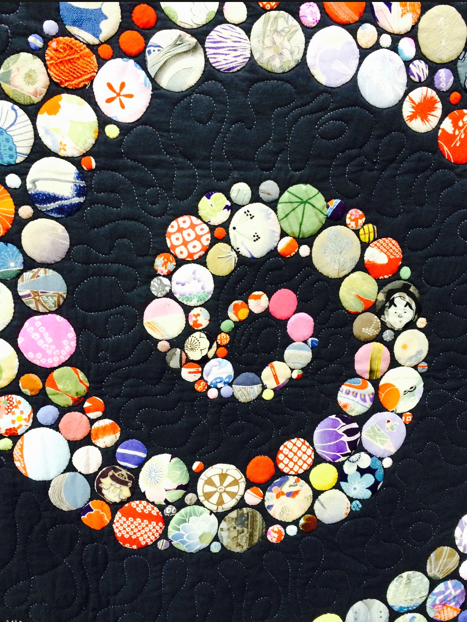 Yoshiko Katagiri's quilt, Life, is made up entirely of appliqué circles of different sizes. Measured at 79 1/2" x 79 1/2", we have no idea how many circles are in the quilt. Would you like to count?