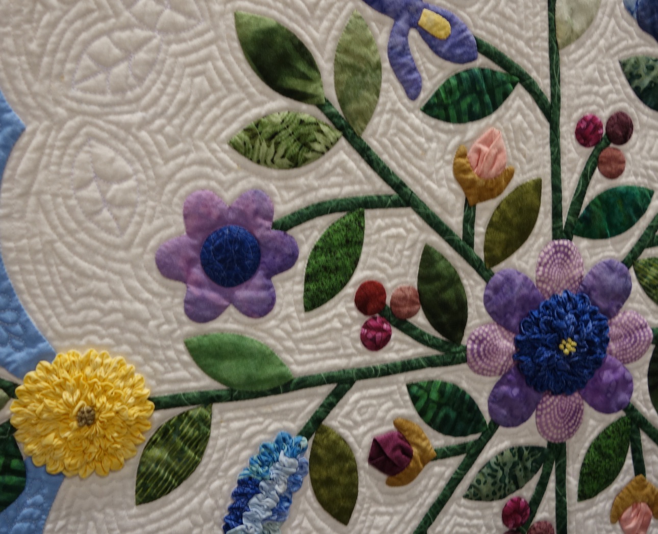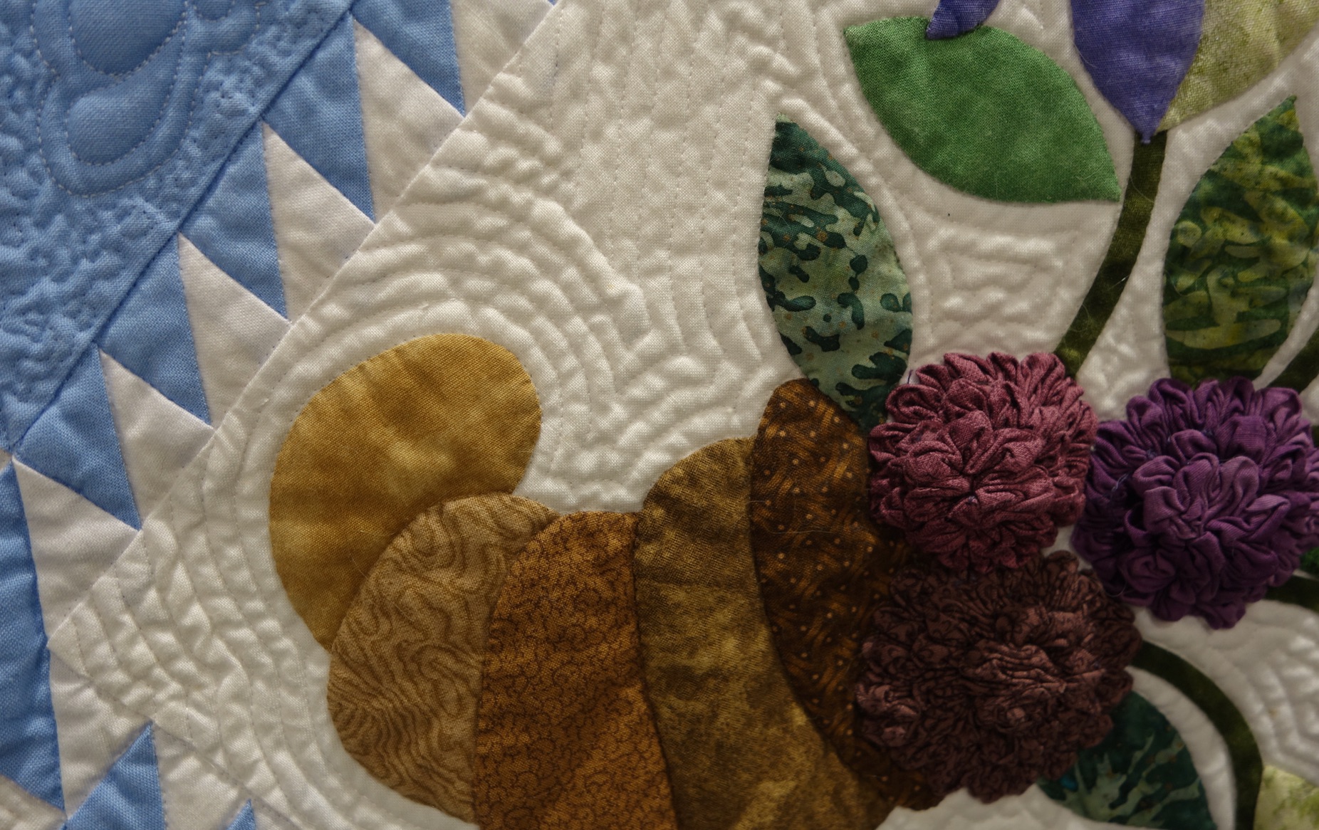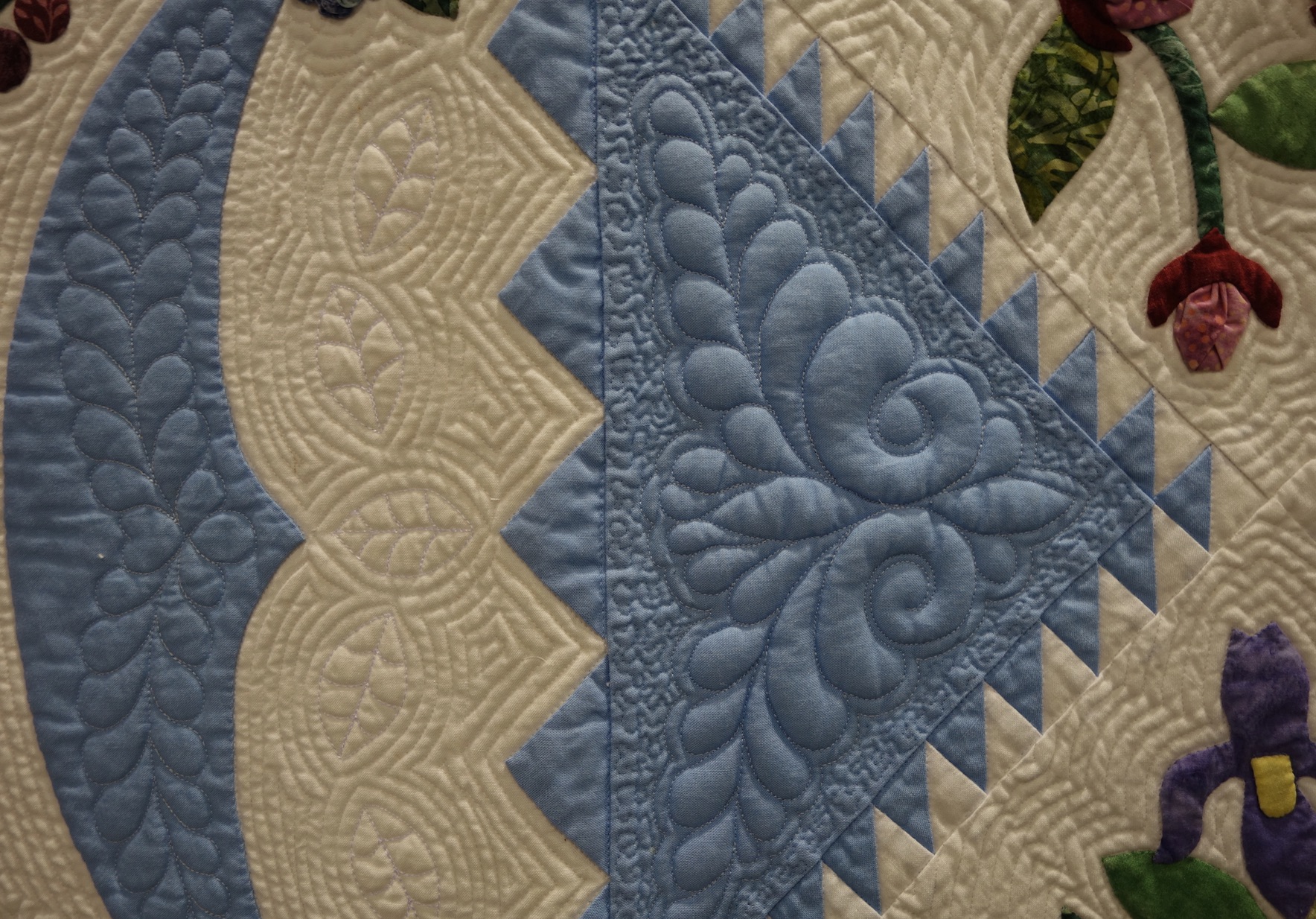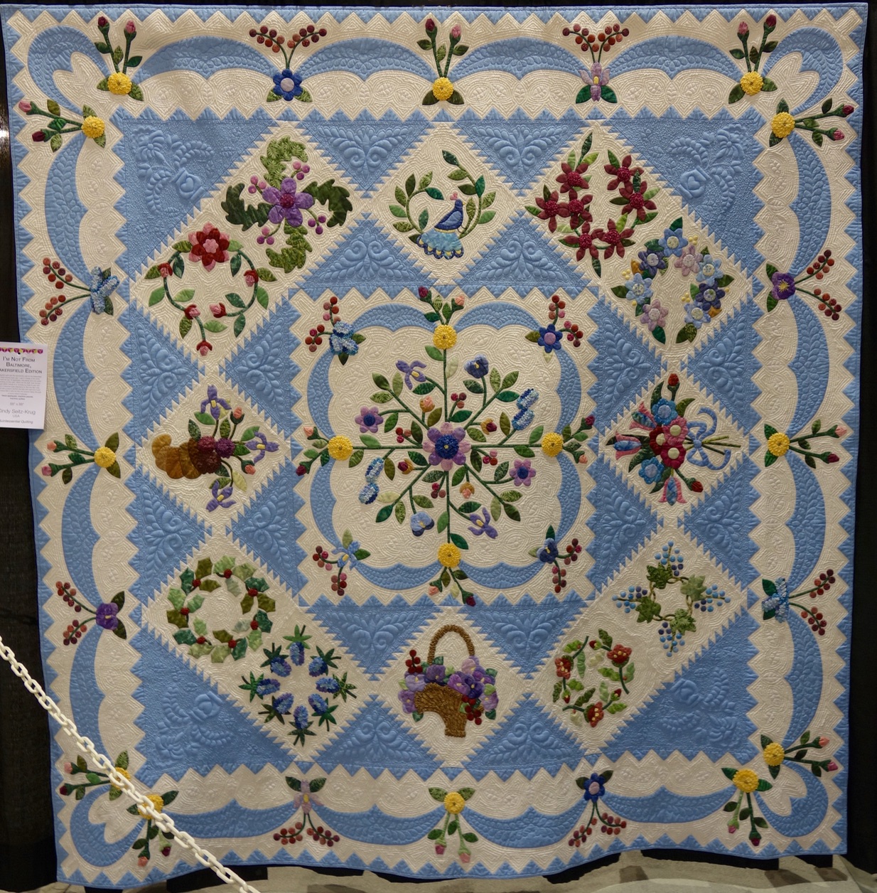 This stunning Baltimore style quilt was hand appliquéd, machine pieced, and machine quilted. Cindy was responsible for the quilting.