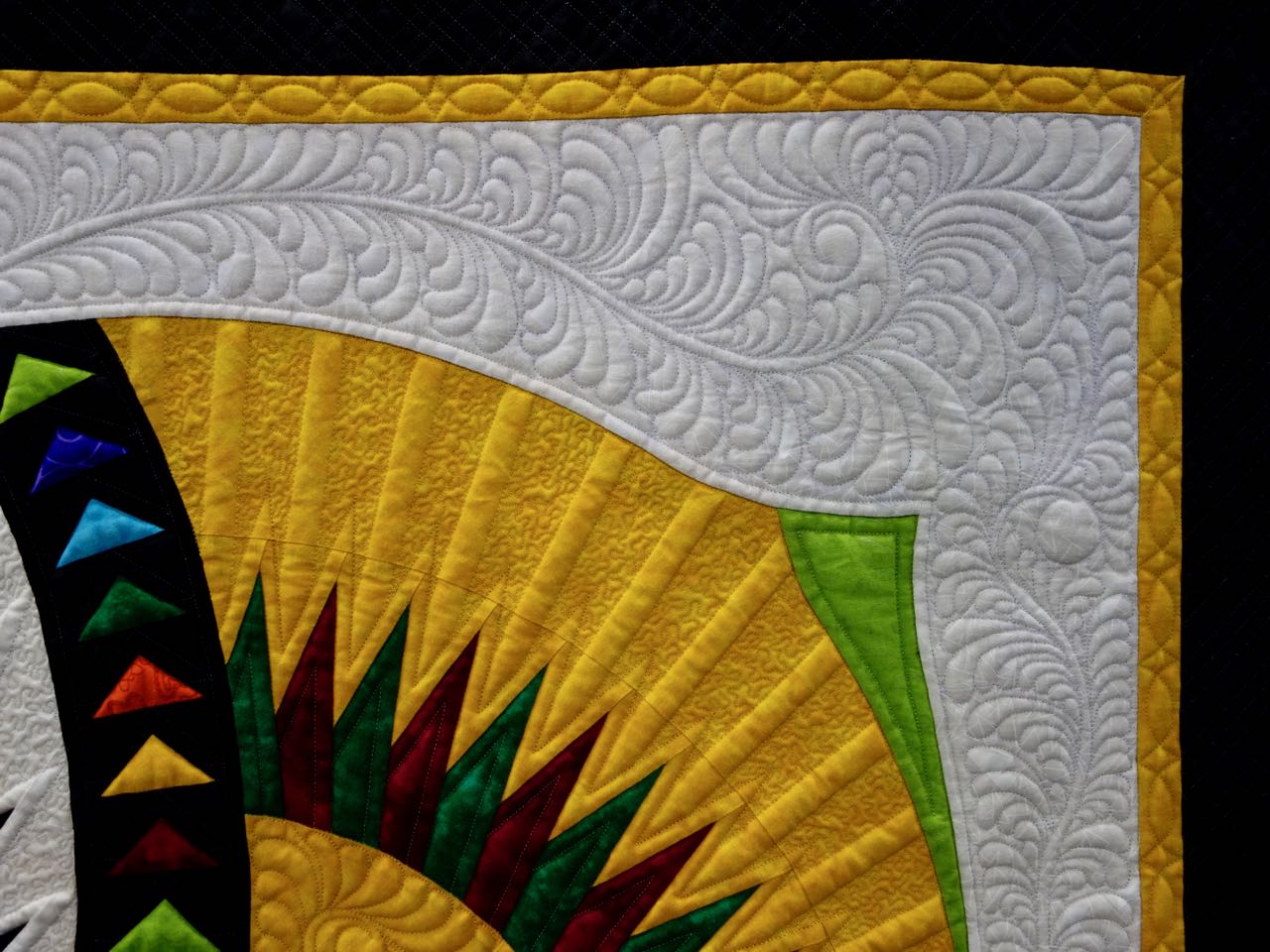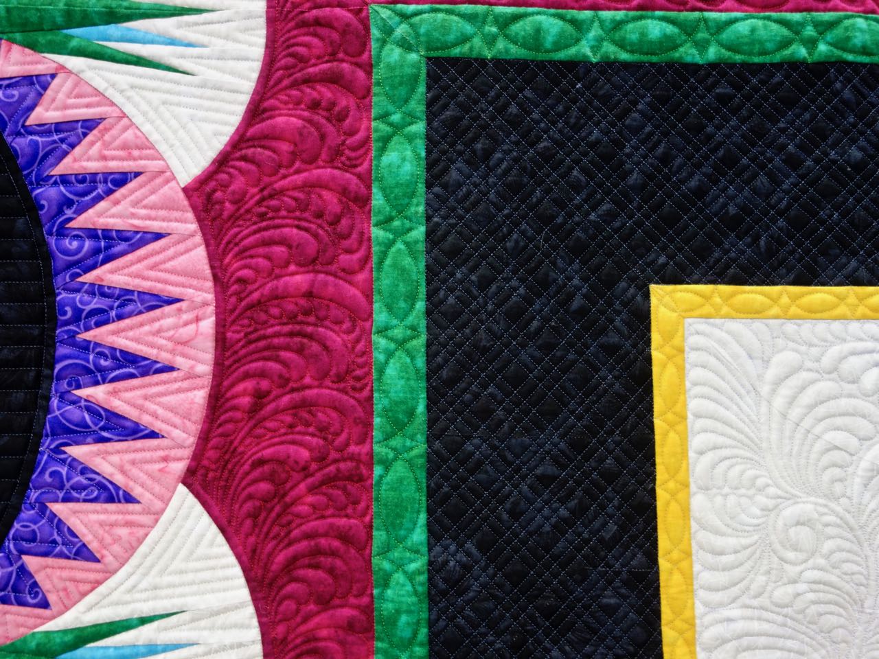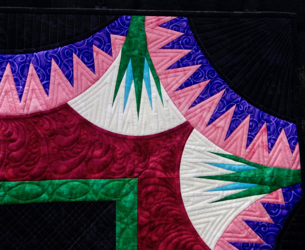 Then you notice that the construction is fun. This is a great pattern, Vintage Rose, by Judy and Bradley Niemeyer at Quiltworx. There are two borders on the inside and no borders on the outside. The use of flying geese on just one side of each of the central designs gives the feeling of movement. I marveled at the exact math that must have been necessary to get the arches to turn the corners perfectly. Also, be aware that your quilt needs excellent quilting. Great quilting is everywhere and the quilting by Juanita Long on this quilt is wonderful. All this combines to make it a eye-popping first entry by May."