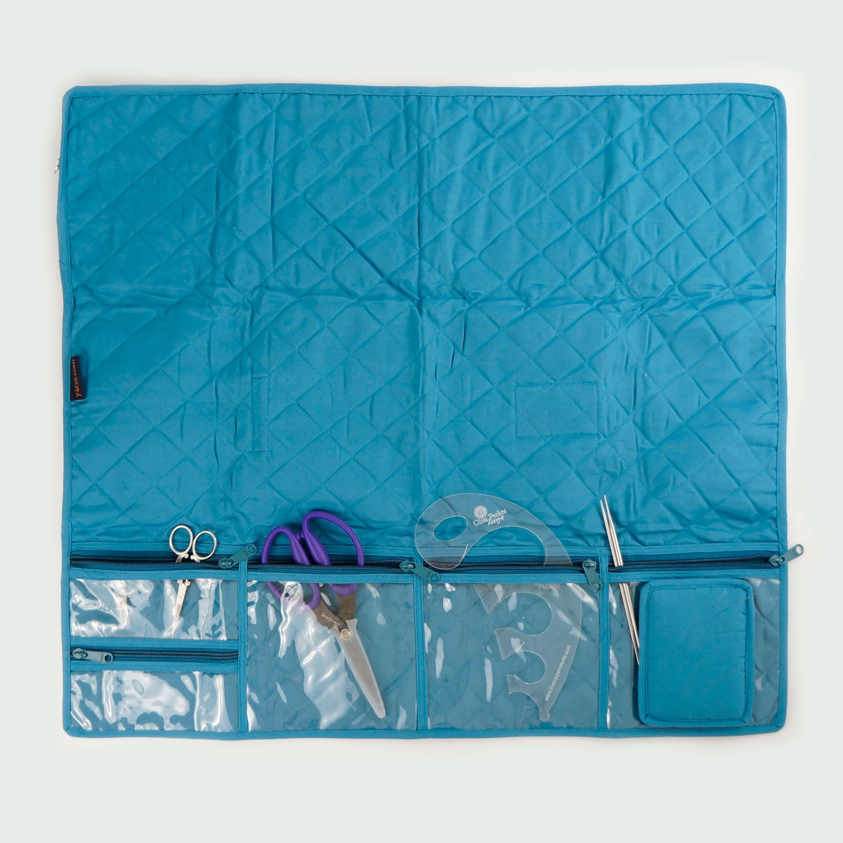 The Yazzii Sewing Machine Mat keeps all of your tools organized and in easy reach. When you are ready to go to a class or retreat, slip the mat out from under your sewing machine, fold it up, and fasten with the velcro tab. Voila - your tools are neatly packed and ready to go.