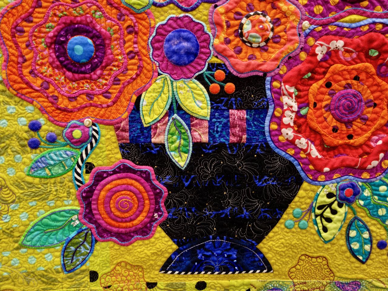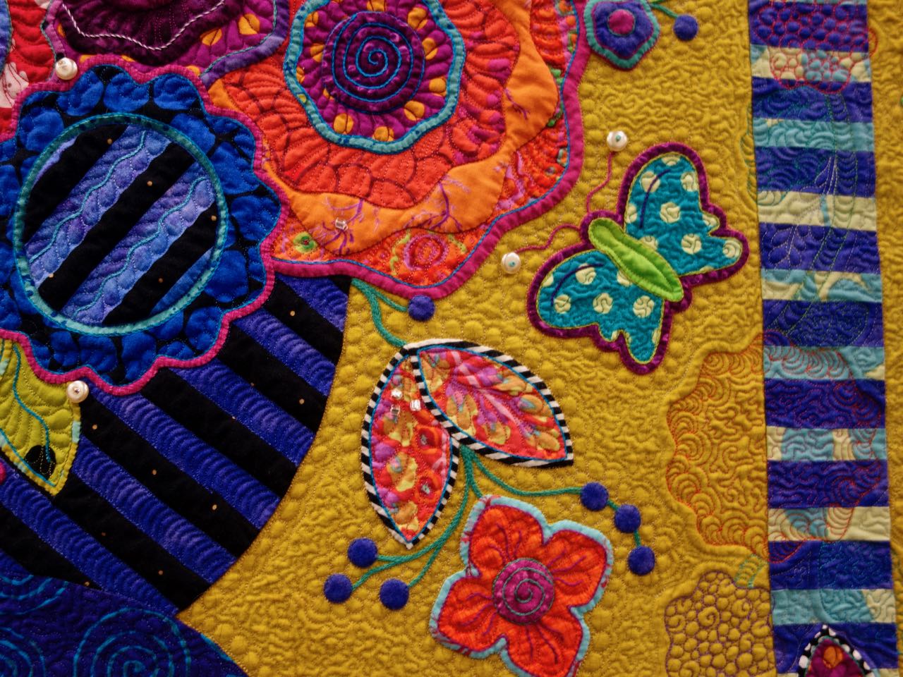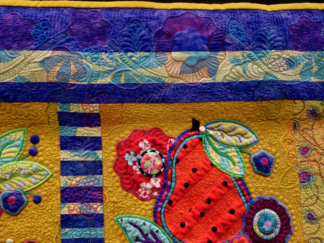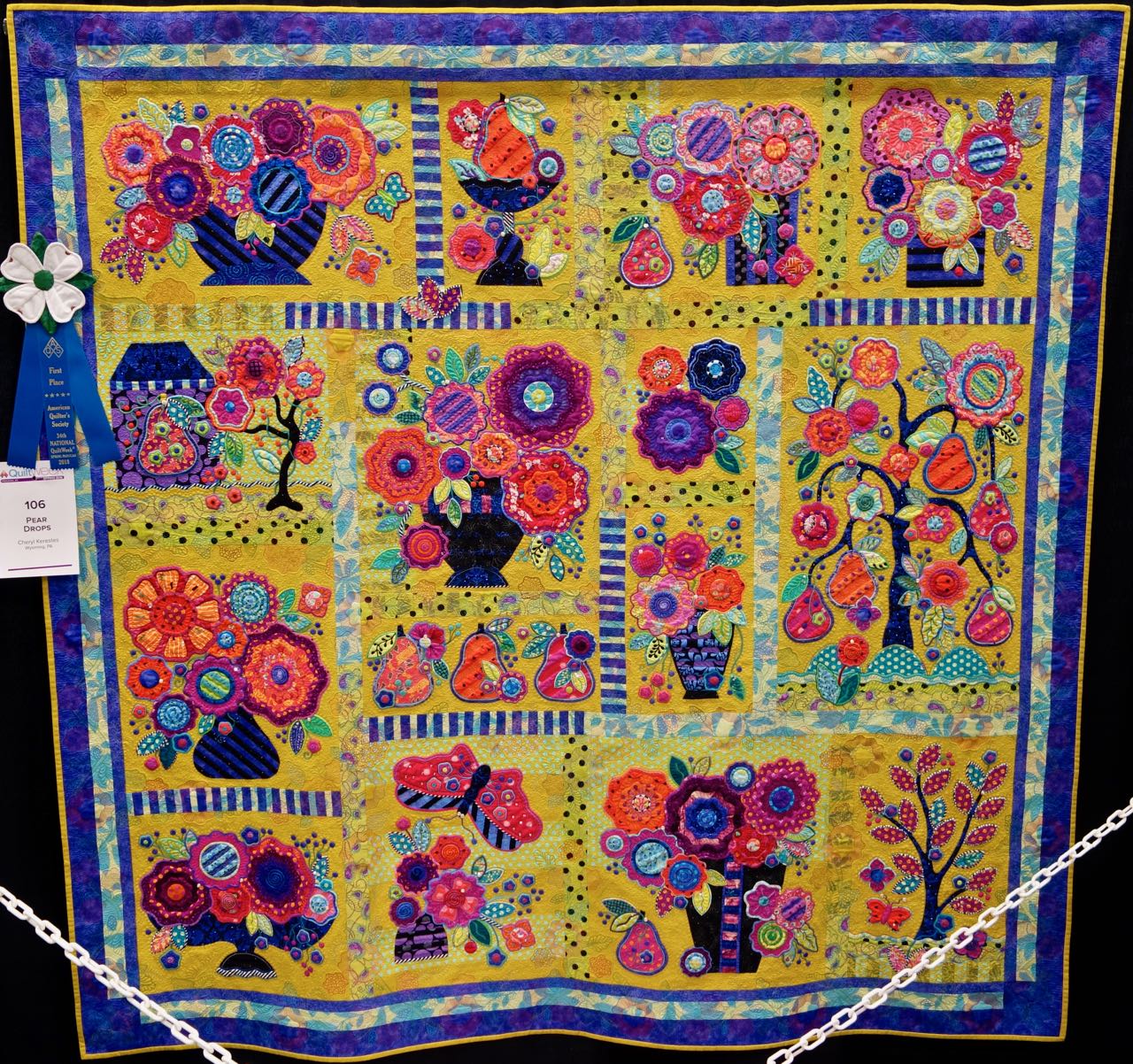 We love this quilt by Cheryl Kerestes called "Pear Drops". The quality of the work is impressive, there are a variety of techniques, and it just isn't anything we expected. It is 80"x80" and has Hand Appliqué, Beading, Hand Embroidery, & Machine Piecing. It was quilted on a Stationary Machine using Free-Motion Quilting. You will love the close ups of this quilt. Take a look...