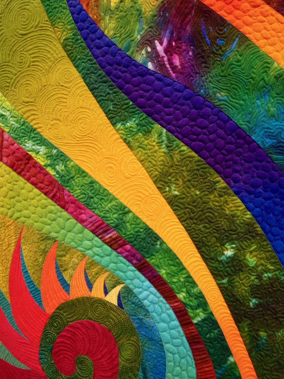 Caryl has won again, this time at Spring Paducah 2018. Her quilt "Celebration #2" (64" x 84") won 3rd Place in the Large Quilts - Stationary Machine Quilted category. This quilt brings all the color, movement, passion and technique she is known for. She used Applipiecing, Hand Dyeing, Free-Motion Quilting, Fabric Painting, and Machine Piecing techniques in this quilt.