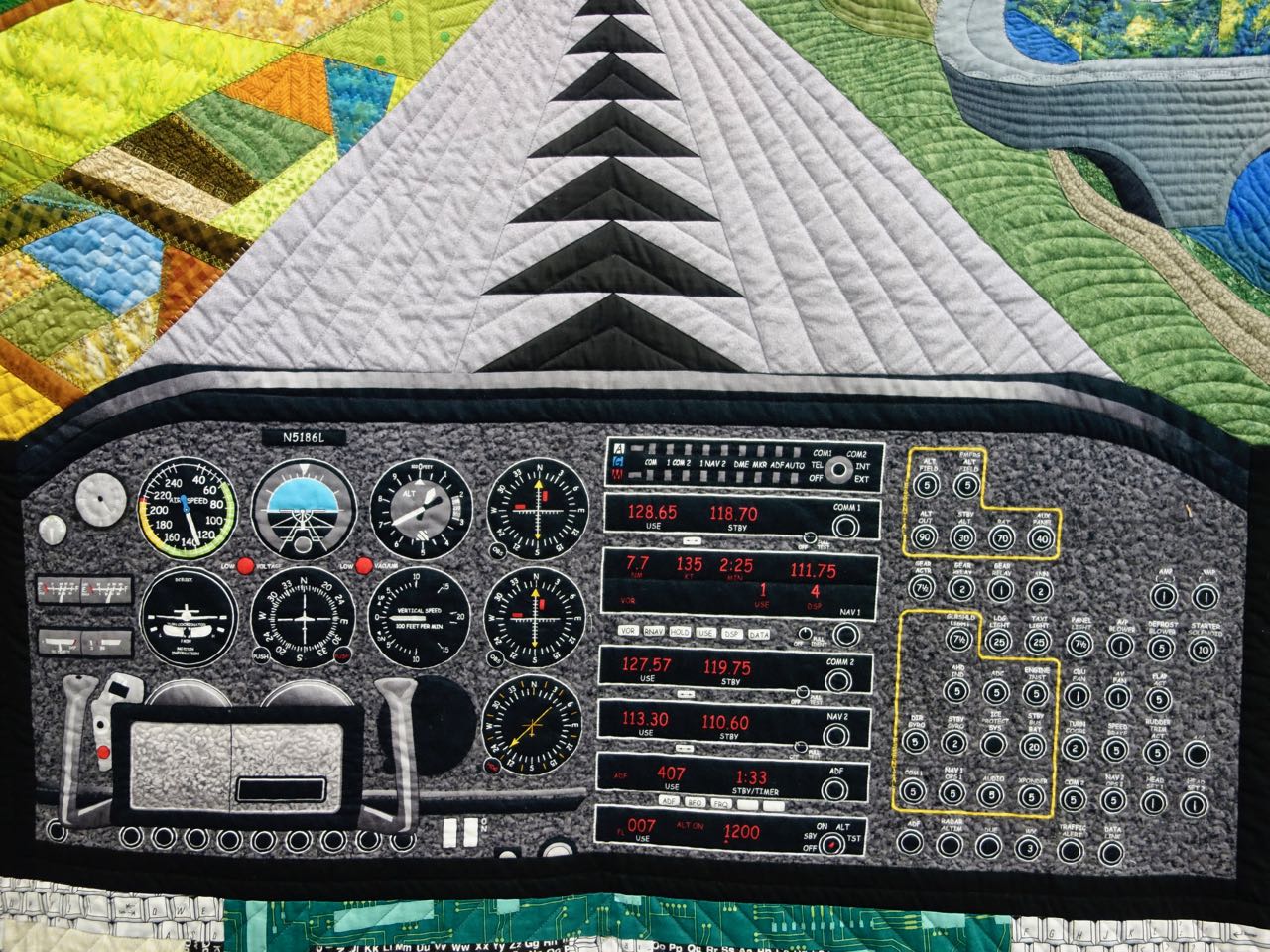 The base represents my Son's job, building and programming flight simulators. Technology print fabrics used in the iconic building block is the industrial beginning to simulated flight training.