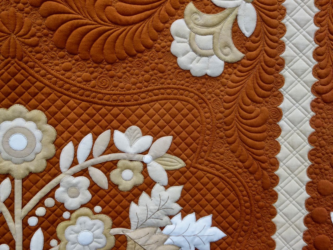 The border must have been a problem as Joyce has said, "This was the first time that I made a double-scallop edge treatment, which I will never again attempt until pigs fly!"