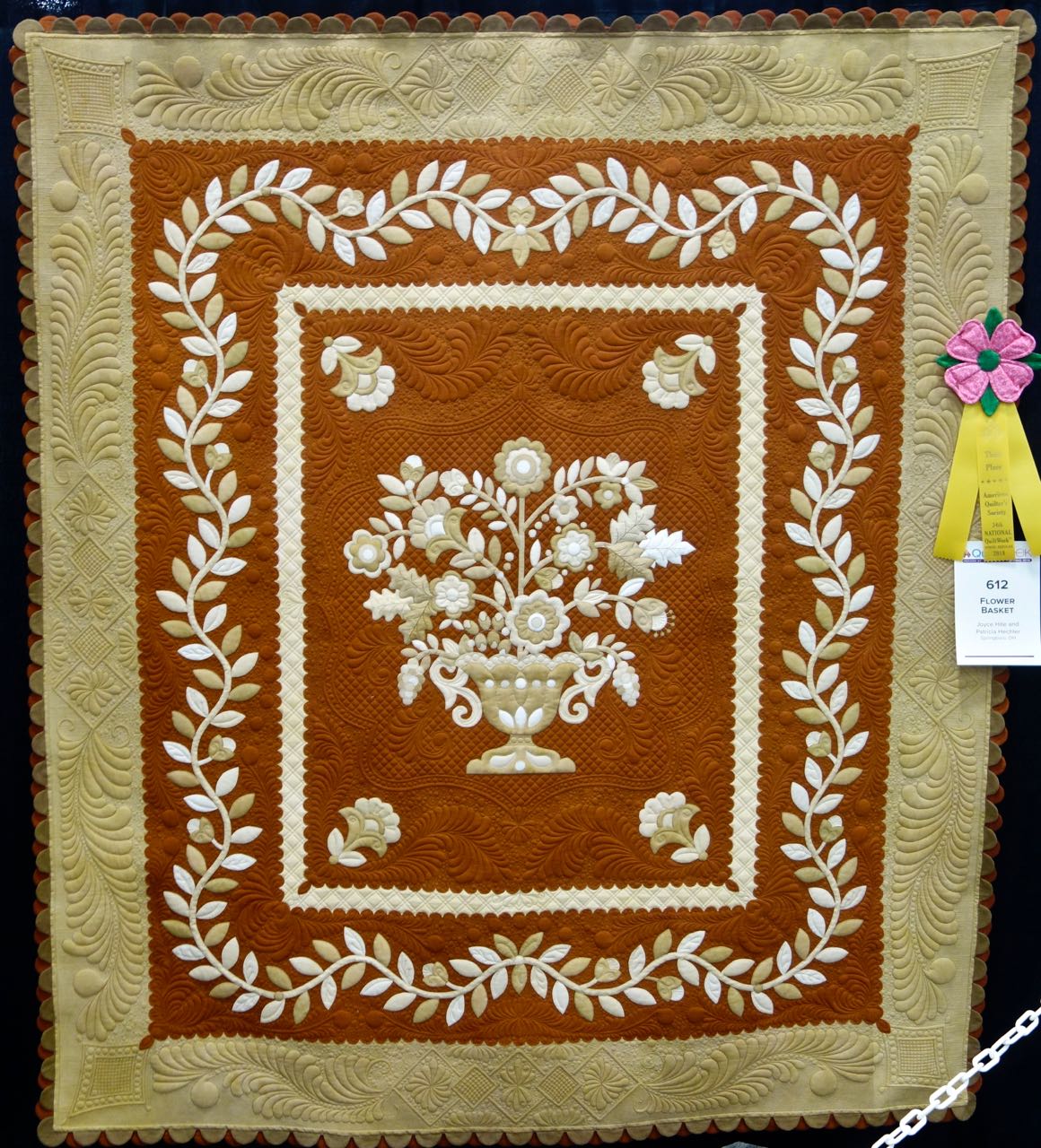Flower Basket, 68" x 78", is based on a pattern by Sue Nickels. The quality of the work by Joyce Hite and Patricia Hechler is fantastic. Techniques used include Fused Appliqué, Machine Appliqué, and Machine Piecing. The quilting uses both Free-Motion Quilting and Computer Assisted Stitch Software to achieve an outstanding design and effect. Plus, we really love the feel and fun of the border.