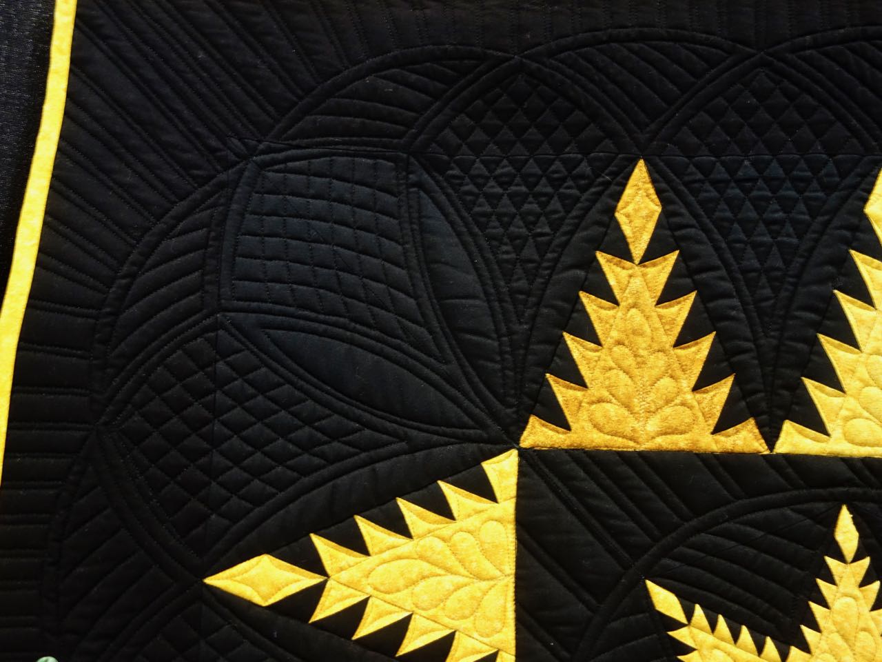 The quilting on this quilt is a combination of Free-Motion and Computer-aided. The black color hides the quilting, so be sure to look at the close up and the video to see the movement and designs.
