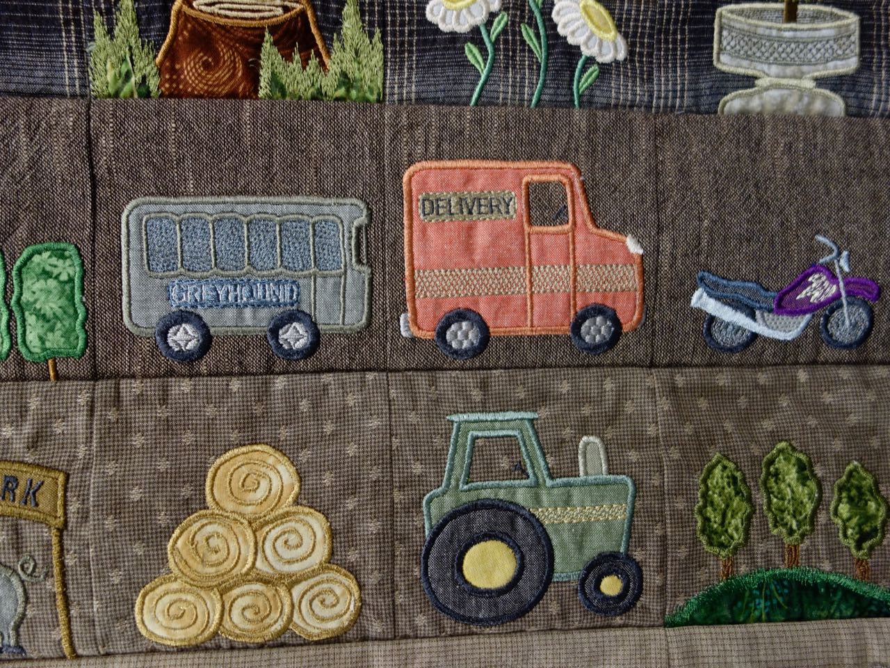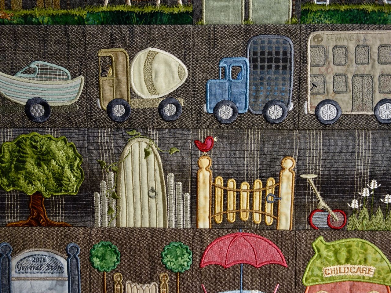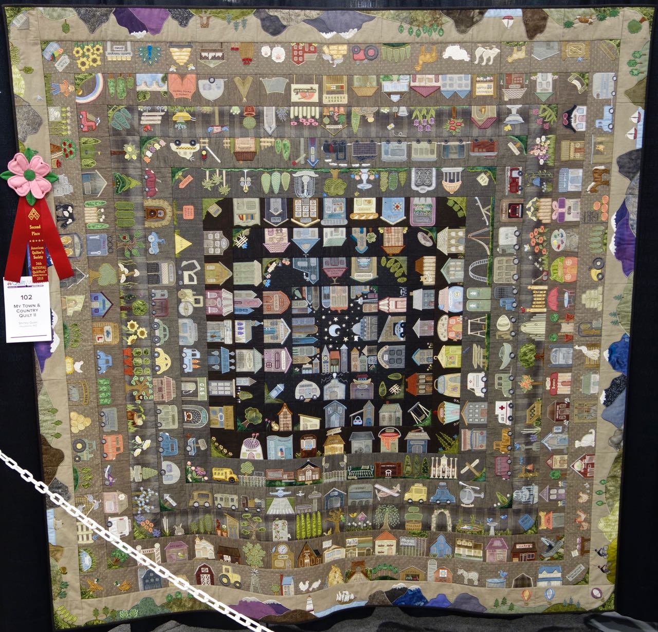 Capt'n John thought the correct name for this quilt should be "Persistence". "My Town & Country Quilt II" is 84" x 84" and is a Block of the Day quilt that has 365 blocks. The Design Source is from Susan-Claire Mayfield, the Gourmet Quilter. Shirley's stitching is beautiful and she used Machine Appliqué, Digitized embroidery, Machine Embroidery, Machine Piecing and Free-Motion Quilting. We included lots of close ups for you.