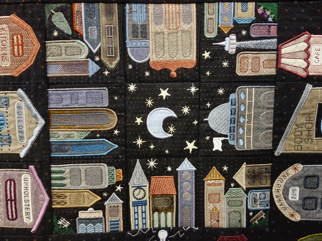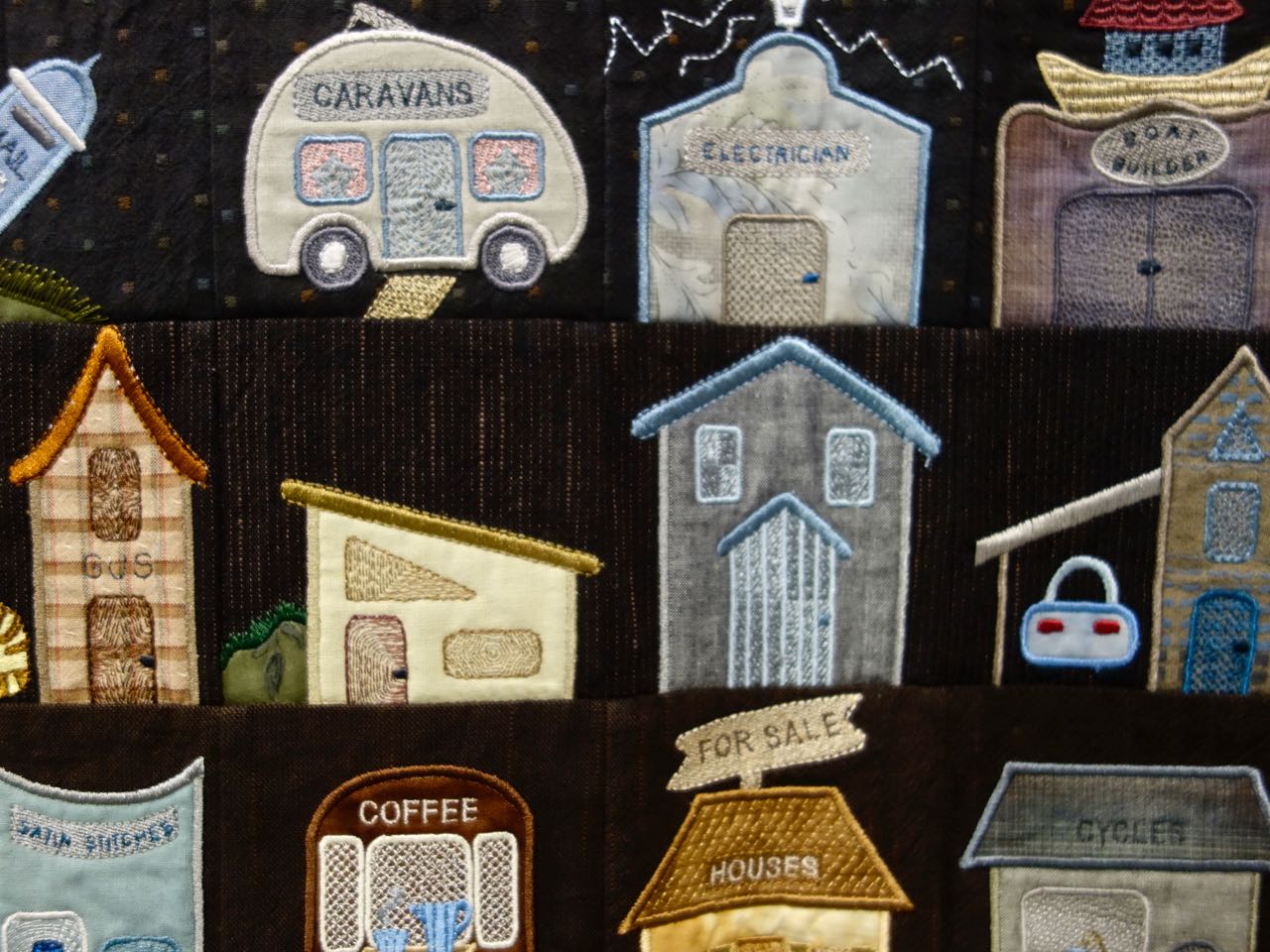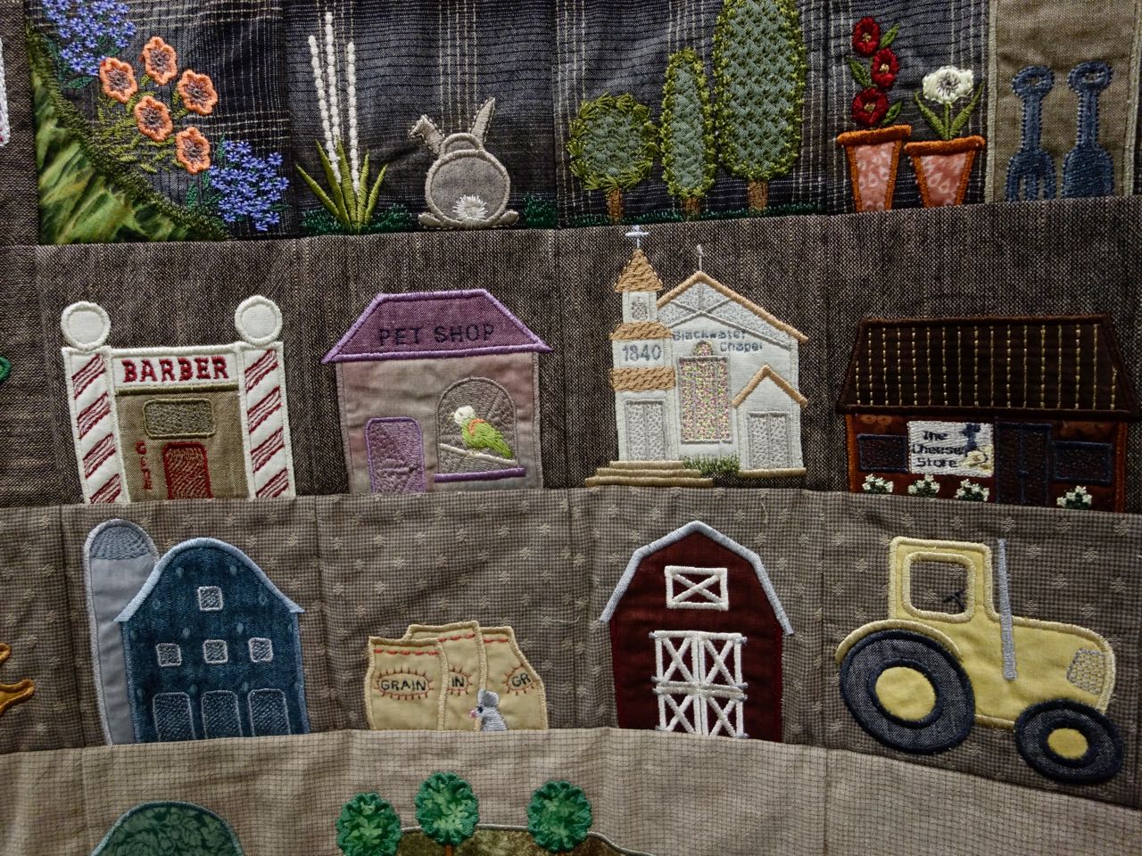 Capt'n John thought the correct name for this quilt should be "Persistence". "My Town & Country Quilt II" is 84" x 84" and is a Block of the Day quilt that has 365 blocks. The Design Source is from Susan-Claire Mayfield, the Gourmet Quilter. Shirley's stitching is beautiful and she used Machine Appliqué, Digitized embroidery, Machine Embroidery, Machine Piecing and Free-Motion Quilting. We included lots of close ups for you.