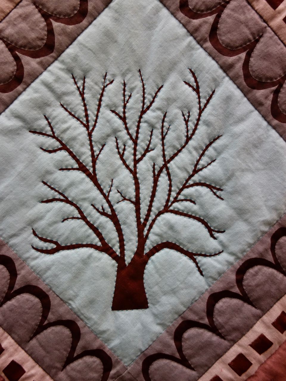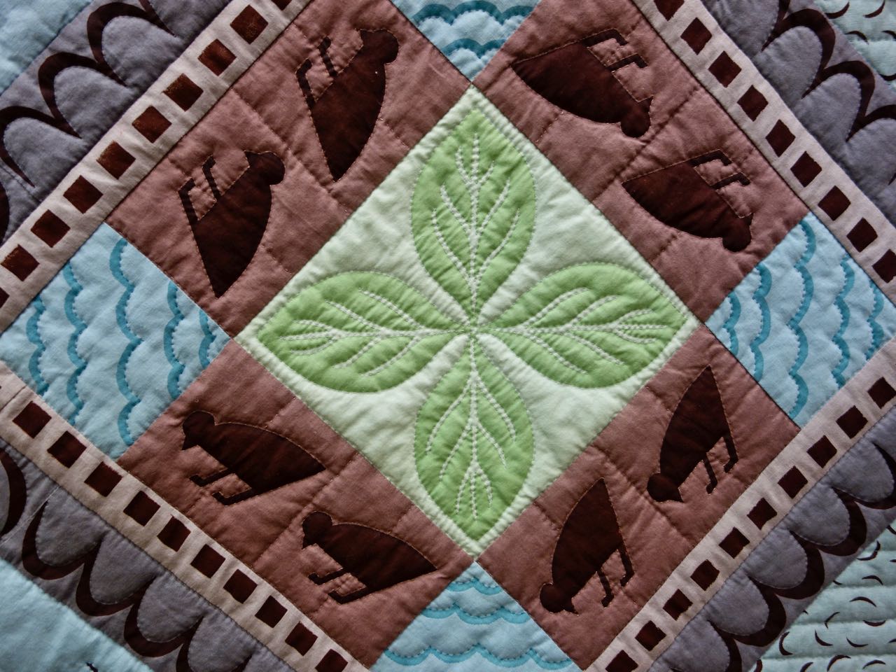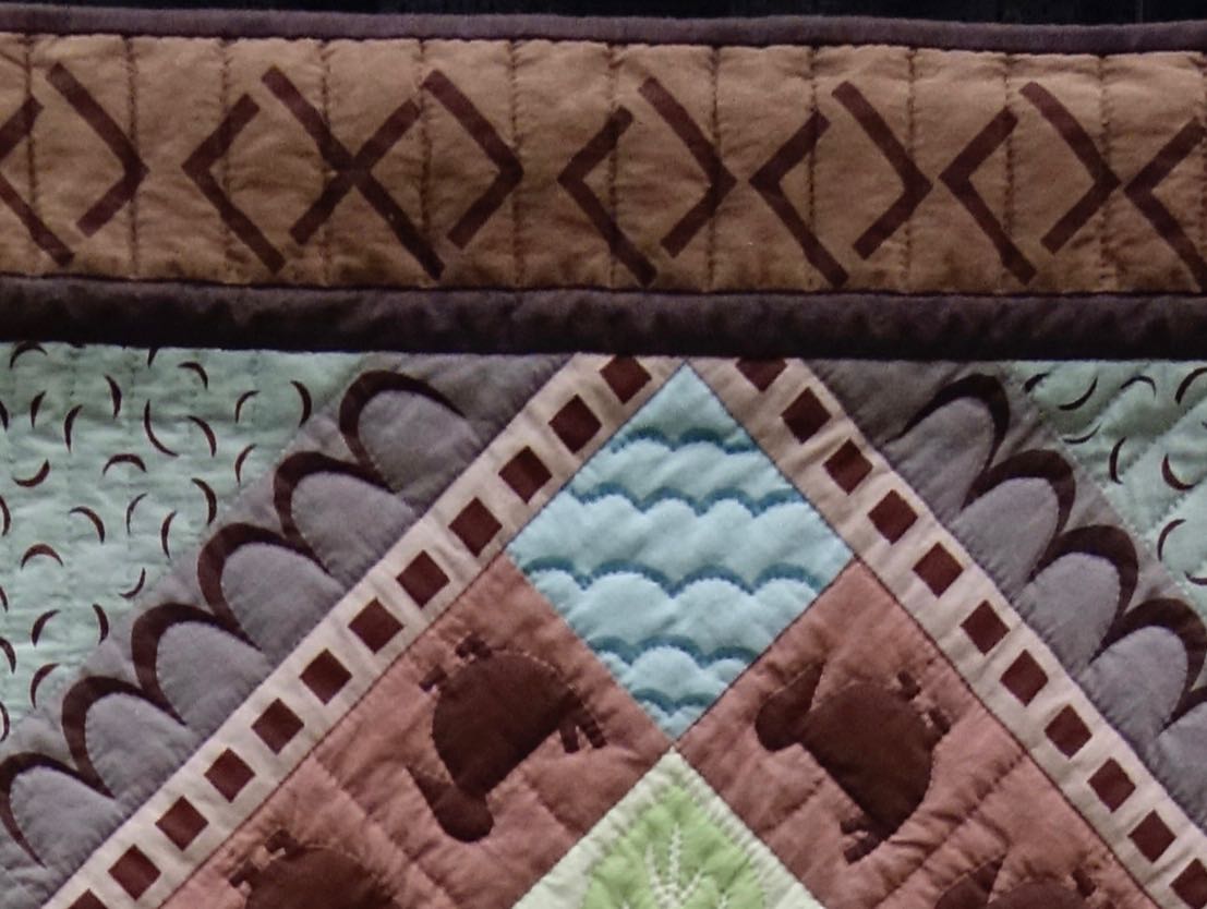 This is a quilt that succeeds by leaving you with the question, "What is fabric and what is painted?". We wish we had more time to see "Lakeside Reverie" (44" x 63") by Hallie O'Kelley up close. The techniques list are "Hand Quilted, Hand Dyeing, Fabric Painting, and Machine Piecing". Appliqué did not appear on the list. So what is painted and what is the fabric?