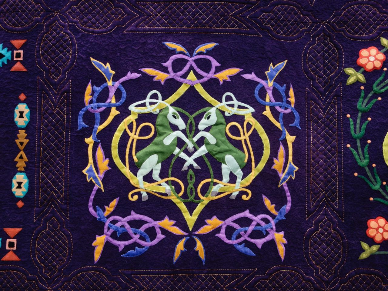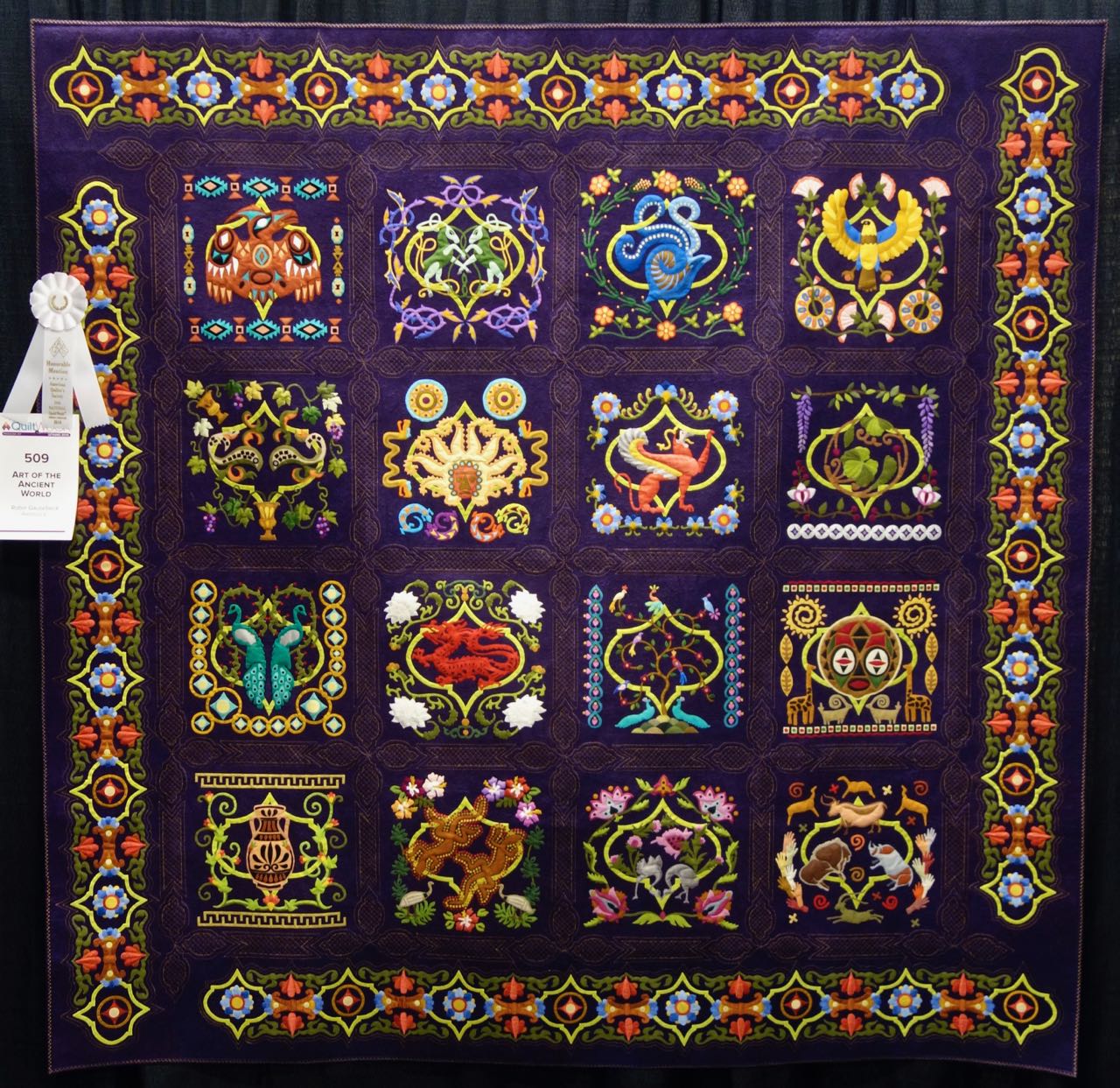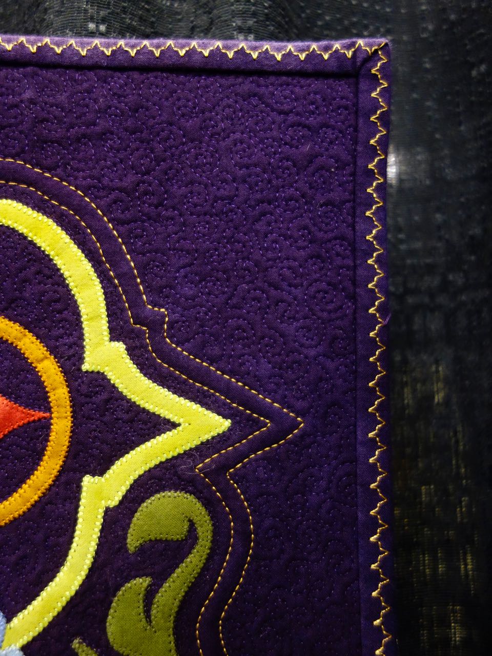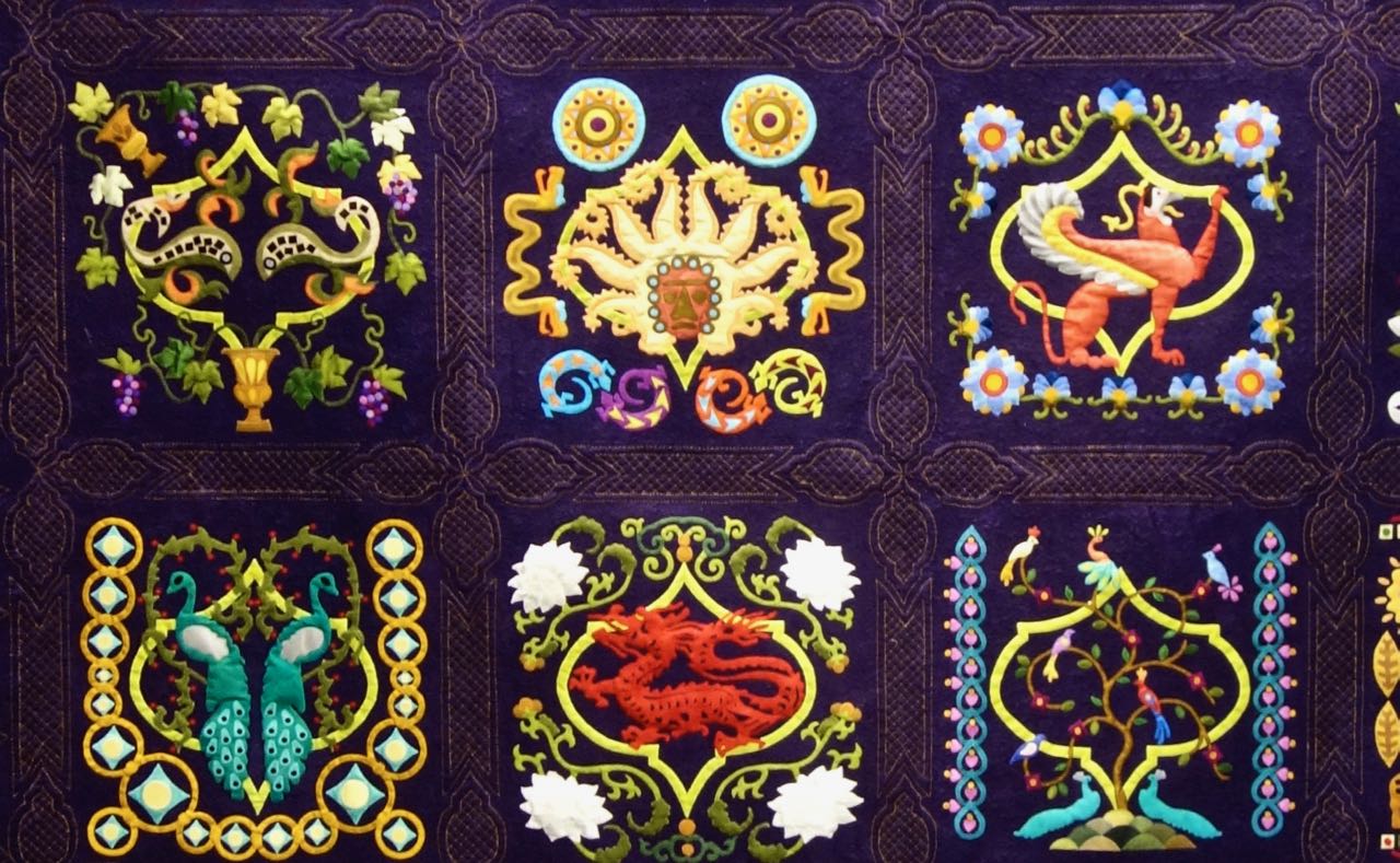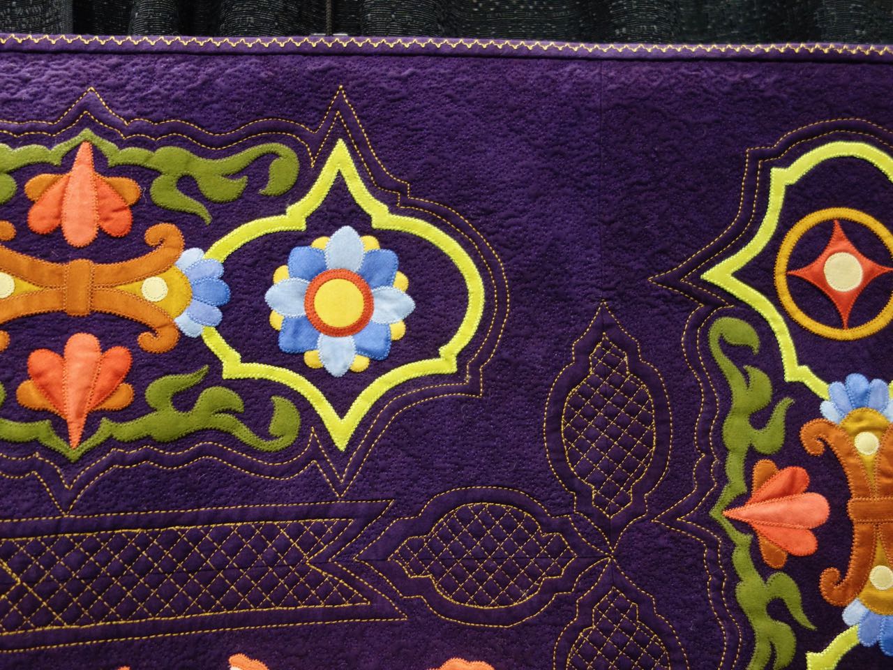 This quilt struck us as a Masters Thesis on Applique. There are curves and waves and figures and points everywhere. Then we smiled as we noticed the binding treatment. We saw this quilt at AQS Spring Paducah 2018.