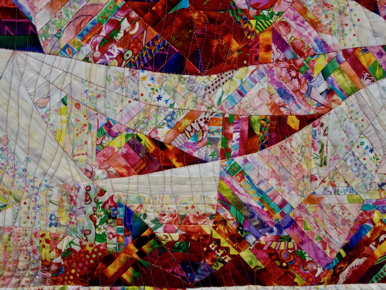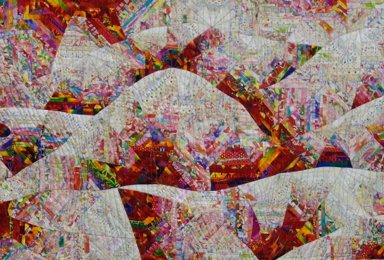 This quilt won an Honorable Mention at Houston 2017 in the Innovative Piecing category. It is also very Innovative in Design. Yoshiyuki created it in memory of a summer bike ride. You can see the mountains and feel the movement. Then get up close and see the piecing. The quilt measures 79" x 64" and uses machine piecing and was quilted on a stationary machine. We took these pictures at AQS Spring Paducah 2018.