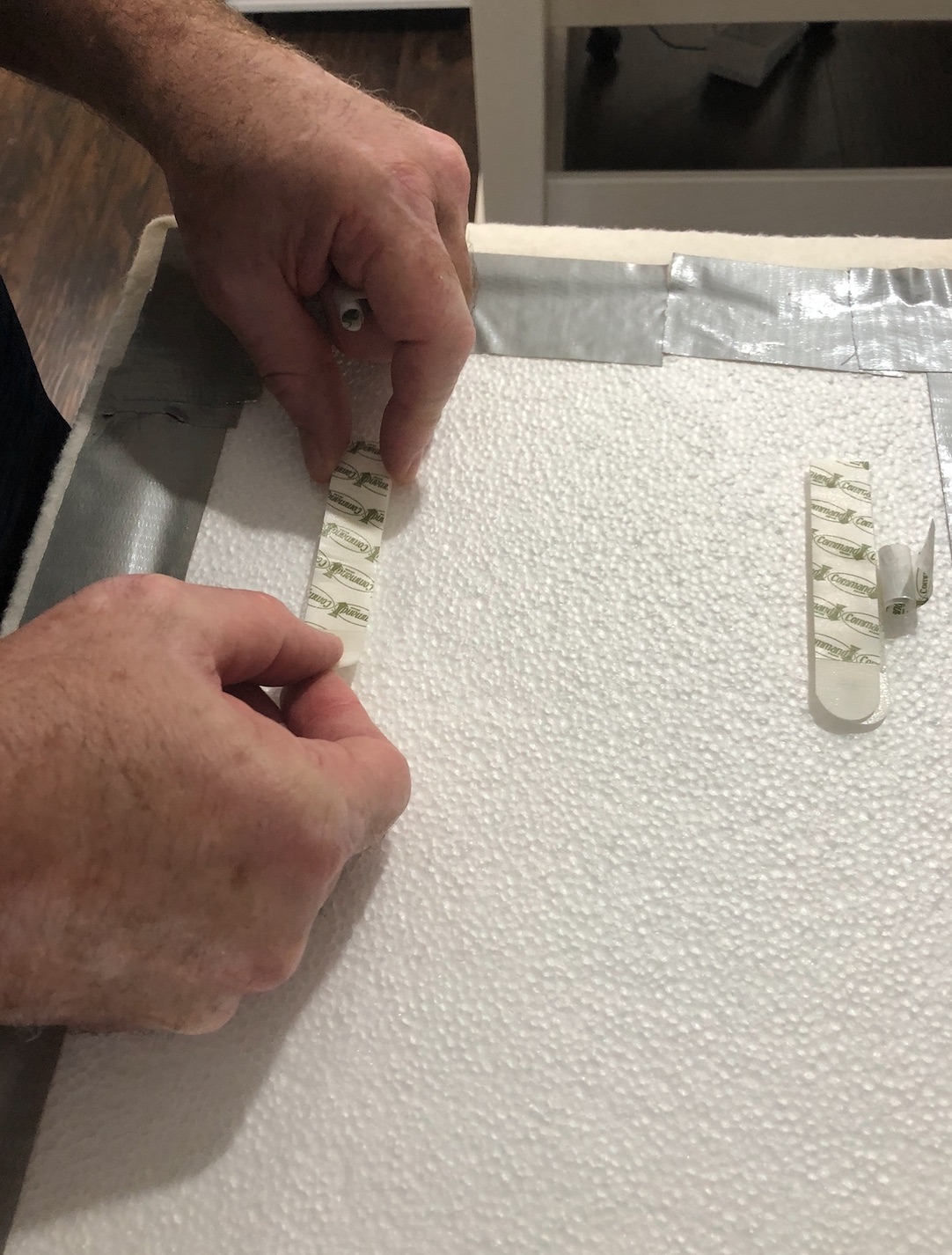· Follow the directions on the 3M Command™ package and apply two strips at the top and two strips at the bottom of each foam panel. Remove the release paper from the 4 strips.