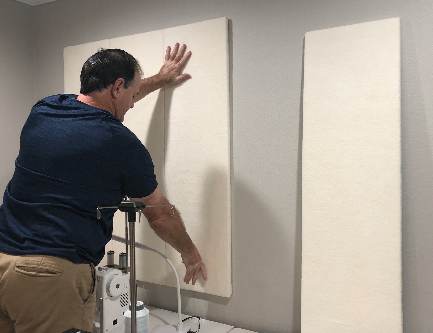 · Use a level to make sure the top of the first panel is straight before pressing the batting covered foam panel to the wall.