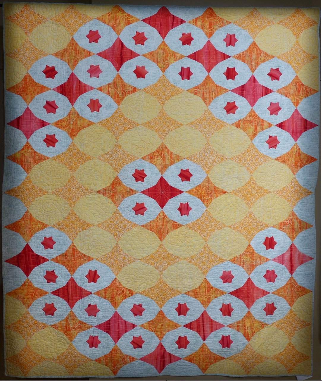 Linda Pumphrey created a quilt from Mountain Mist Pattern 44, copyright 1934. This pattern title was copyrighted during the Golden Age of Hollywood in the 1930s. The pattern for this piece says, “In answer to the demand for really new pieced quilt patterns, we offer this highly interesting original design that included appliqué stars to heighten the effect.” We feel it looks modern today.
