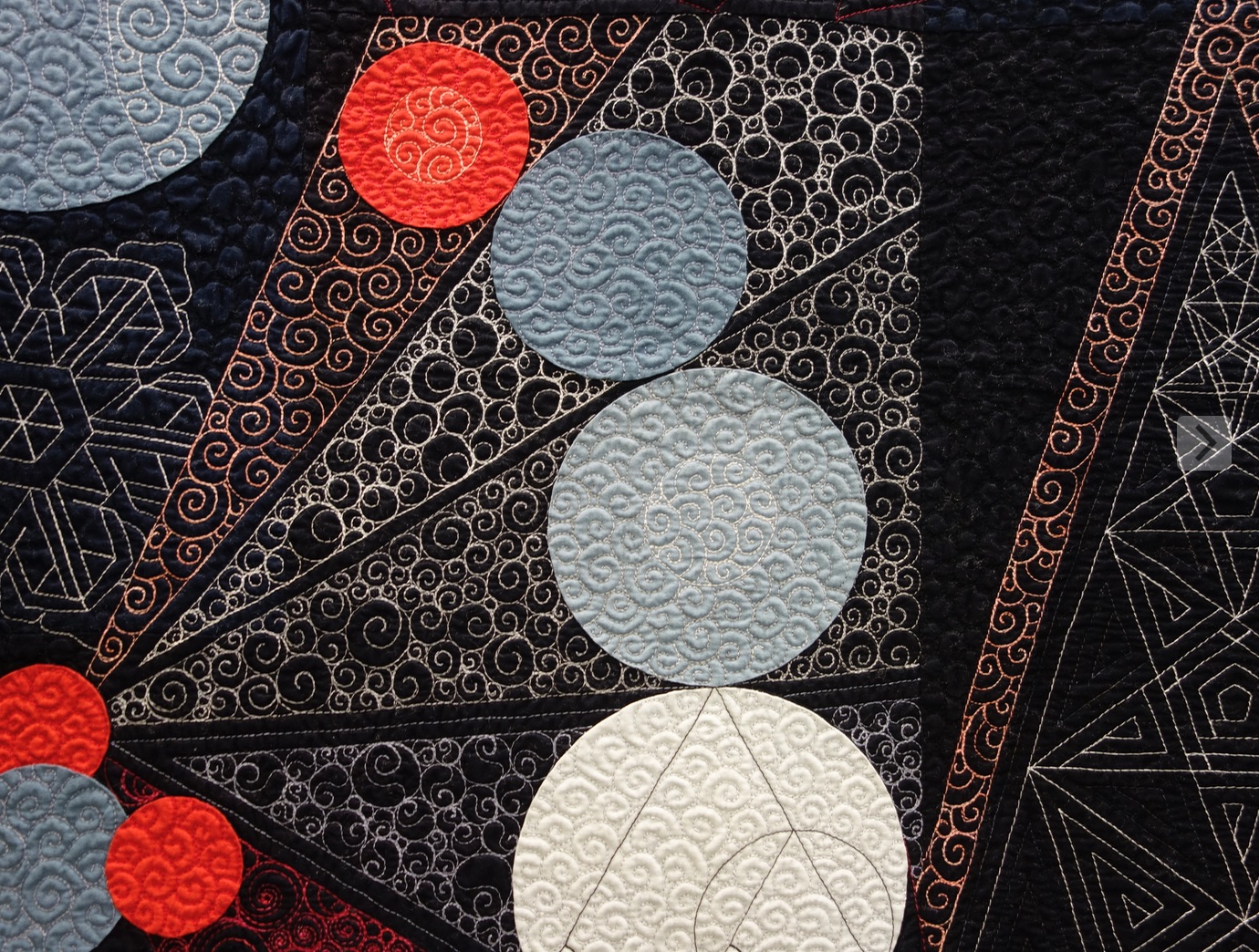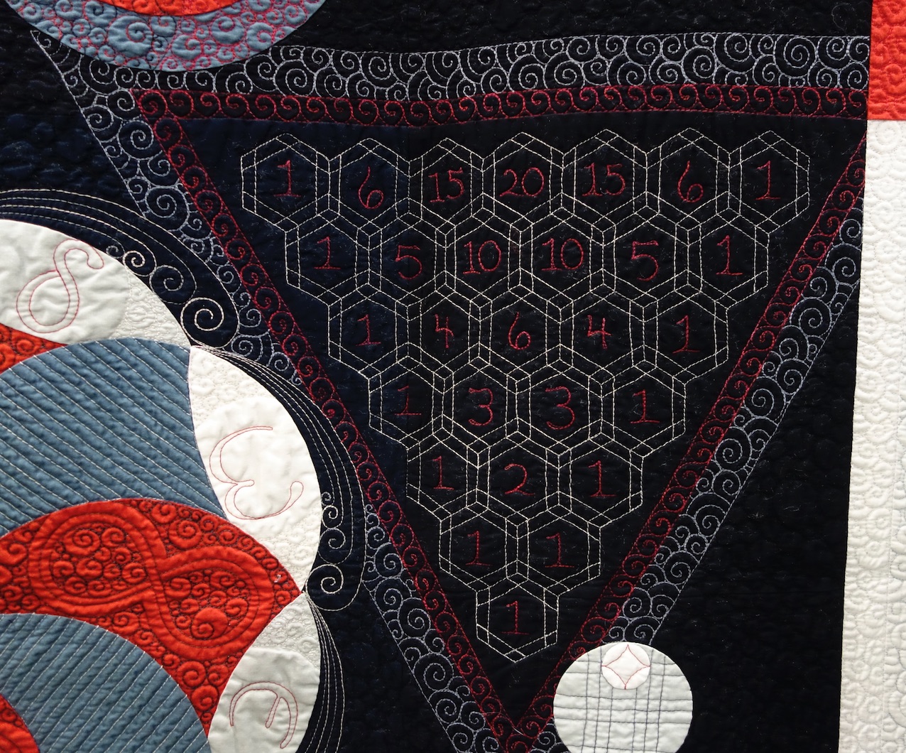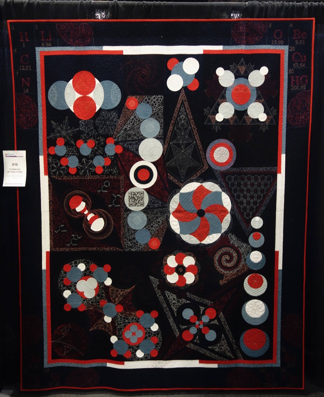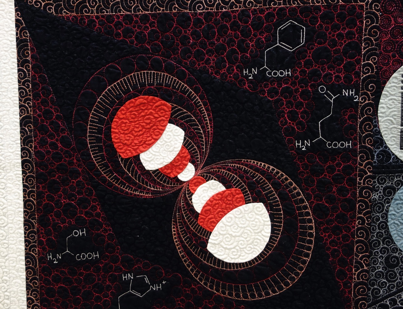 Swan Sheridan's quilt, Chemical Attractions, began as an accident of sorts. It started out as an appliqué pillow sample and ended up a stunning quilt based on chemistry. And while the appliqué is beautiful, we love the truly unique geometric and "orbital" quilting.