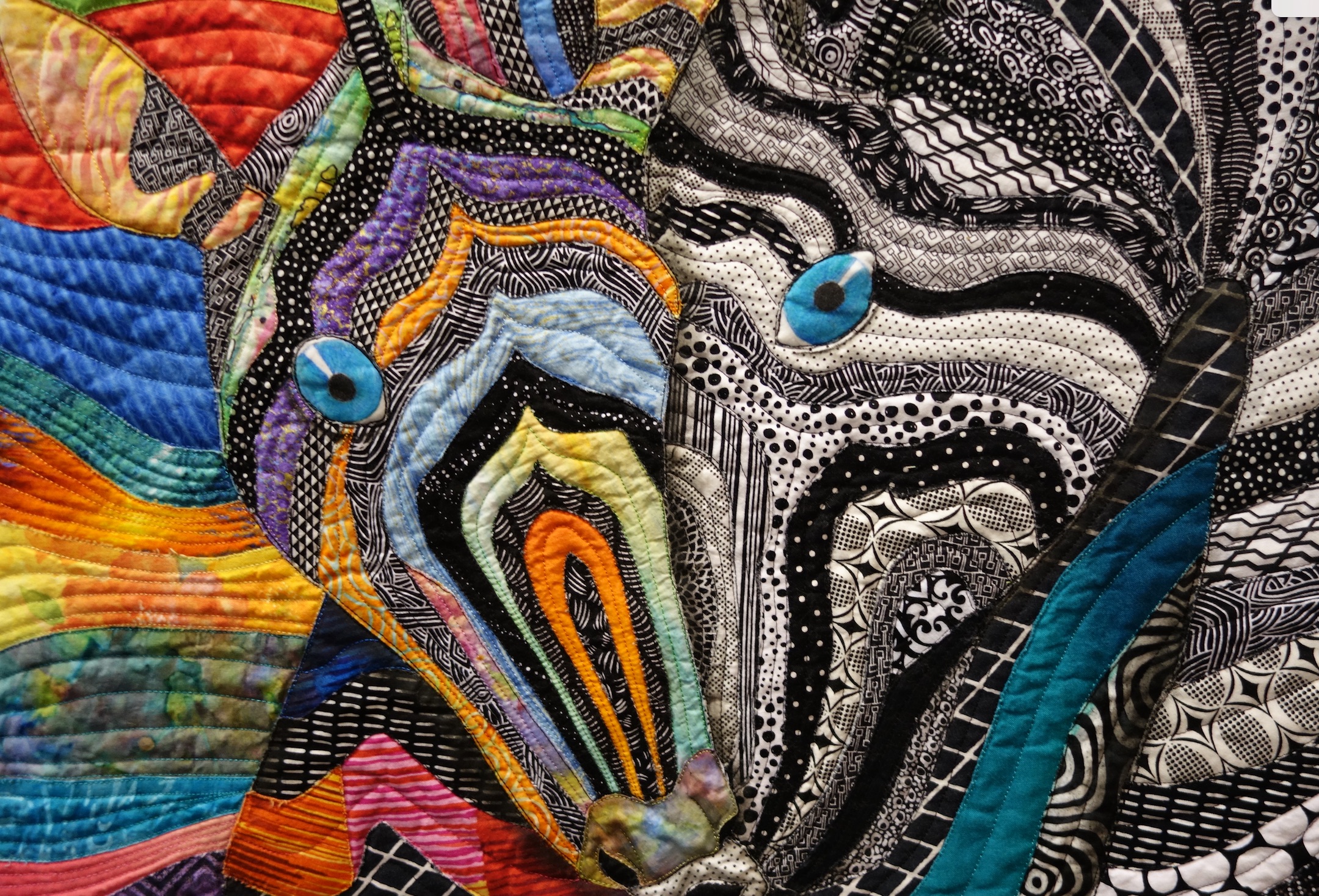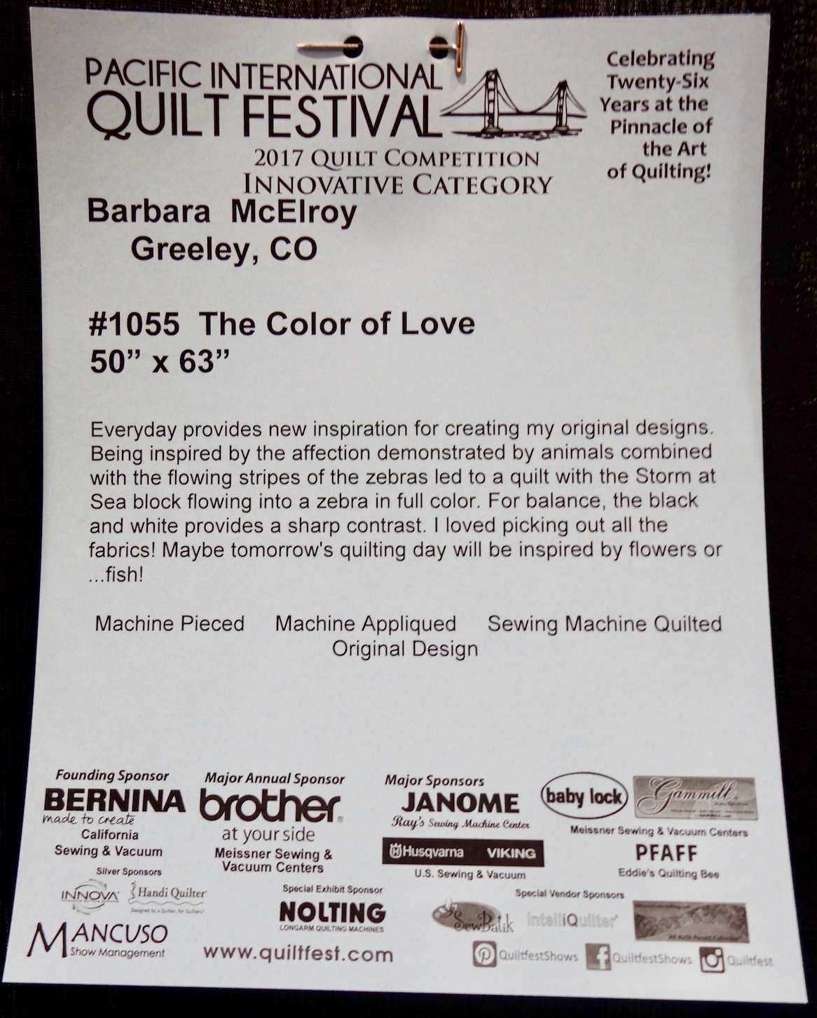 This quilt, The Color of Love, by Barbara McElroy was inspired by the affection demonstrated by animals and proves that not all zebras need to be black and white. The photos were taken at the Pacific International Quilt Festival 2017.