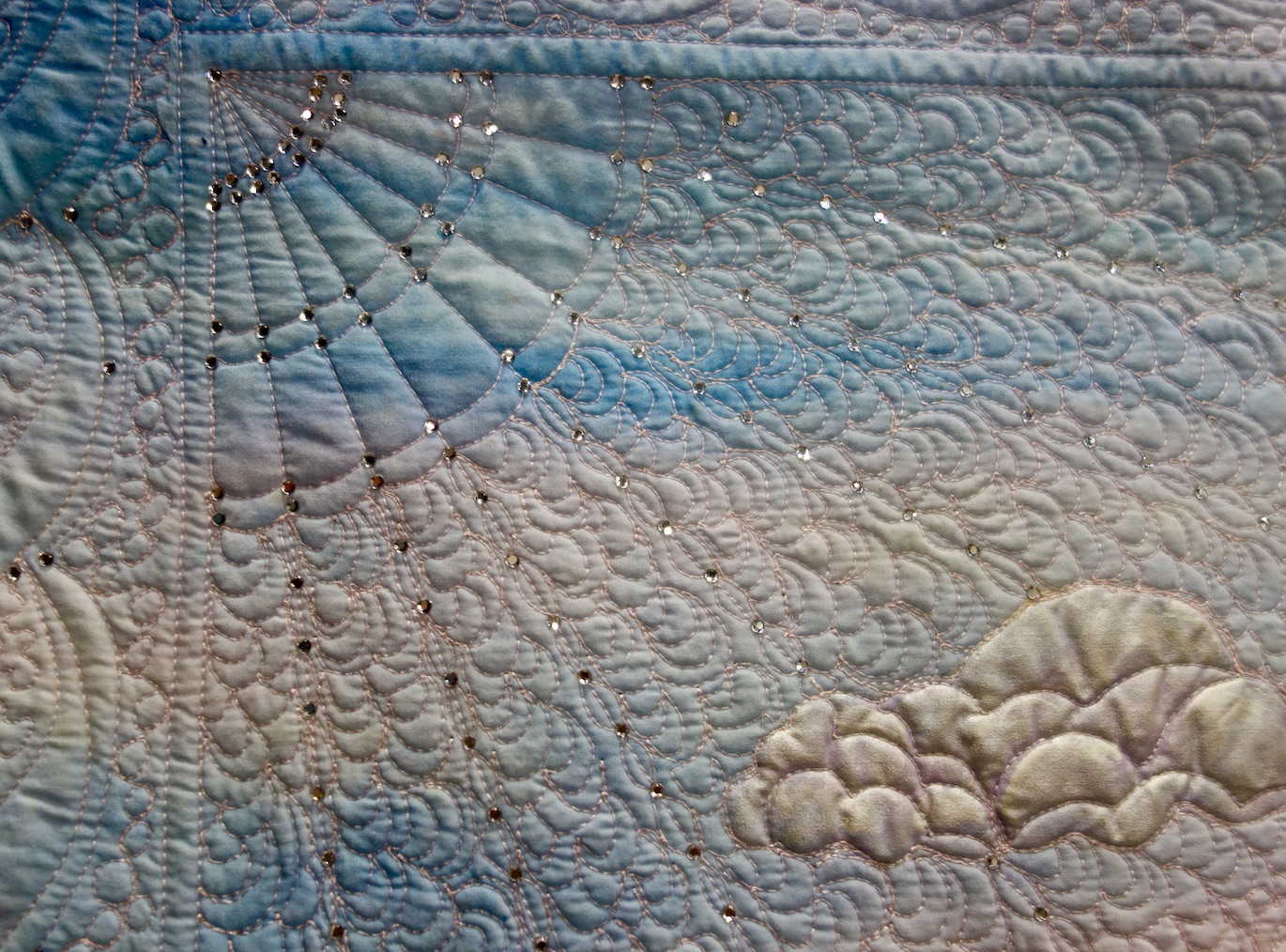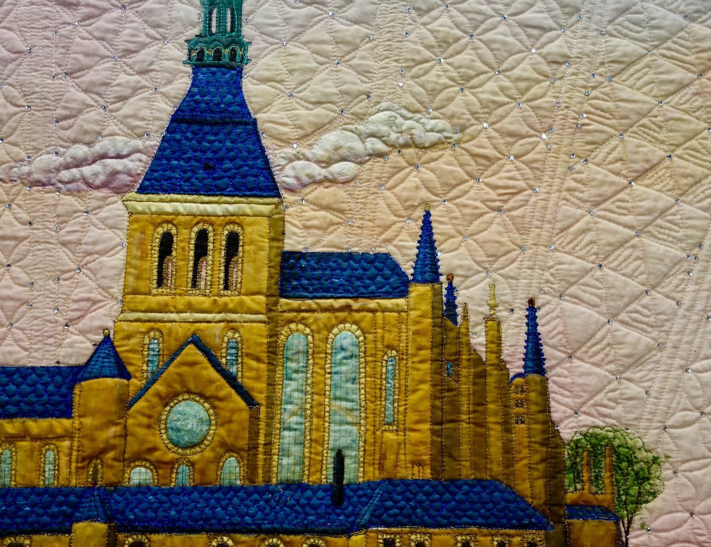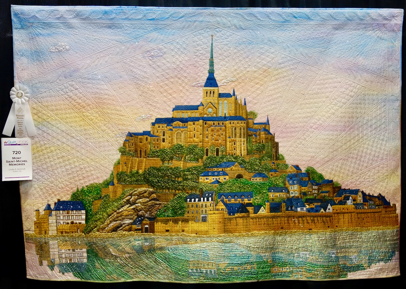 Linda writes, "My most recent “waves” piece is Mont St Michel - a cathedral, monastery, and town just off the northern French coast. Based on my own photo, it was great fun to paint the sky, paint the buildings and reflections, then add a whole lot of complicated quilting and crystals to really make it shine!"