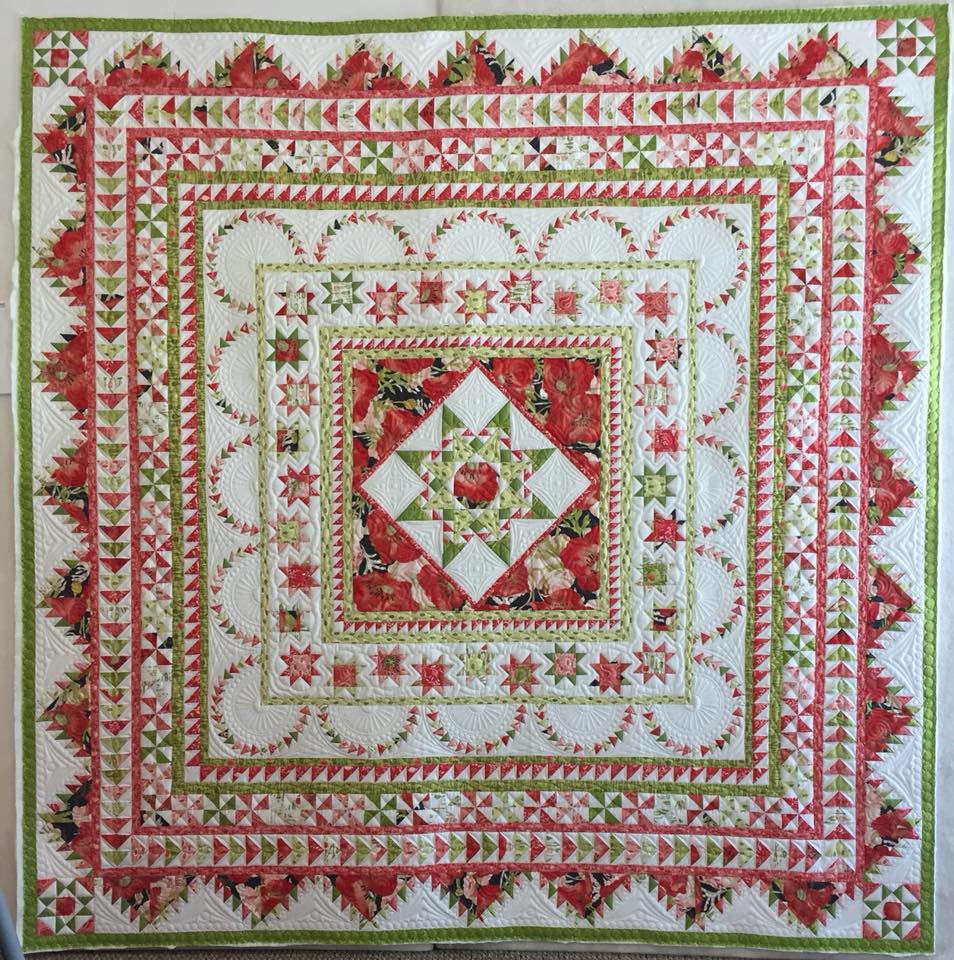 Ta Da! My version of the Halo Medallion Quilt designed by the late Sue Garman and quilted by Lois Squyres Kindley. I cried when I saw it!!! It’s not quite finished, needs the binding and to be blocked. The beauty of the quilting enhanced my piecing perfectly. Thank you so much Lois for your creative quilting artistry. To Barbara Black and the Sunday Sew and Sews—I did it! Thanks for all of the encouragement and guidance (along with two other quilting friends I leaned on repeatedly). But Chuck Erickson is the real winner. Through thick and thin and several swear words plus two broken arms he supported me at every step. Thank you God for sending him my way and for keeping me on the path to do my best work ever!