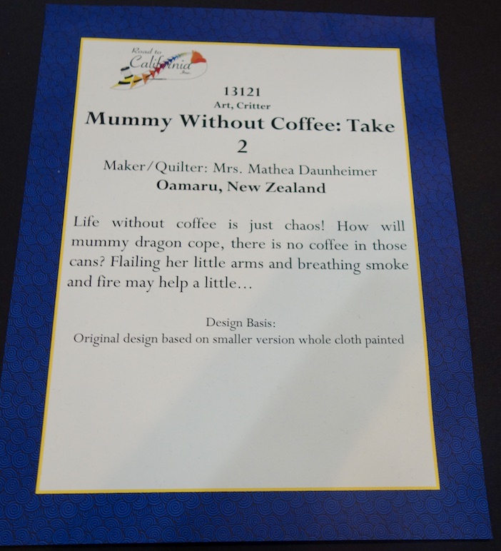 Not all quilts are serious. We came across this one at Road to California and it just made us laugh. Enjoy "Mummy without Coffee: Take 2" by Mathea Daunheimer of Oamaru, New Zealand.