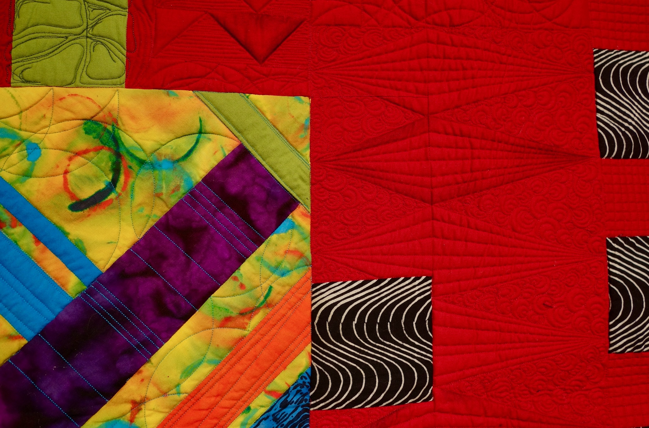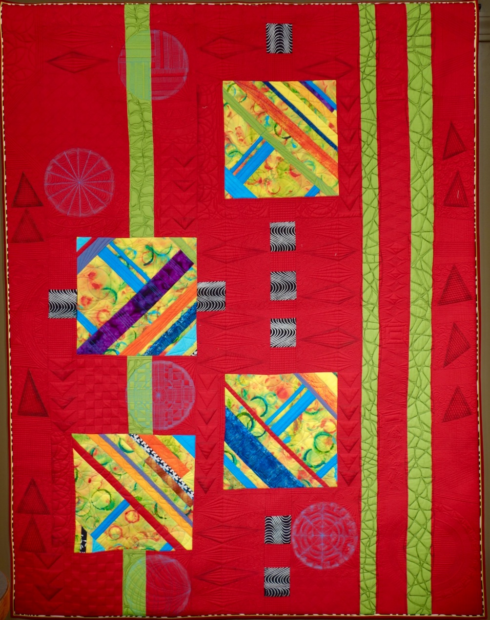 Cathy's quilt, Big Red, is a very modern quilt featuring the reds and greens that Cathy loves. She painted the background squares and included some truly incredible quilting designs.