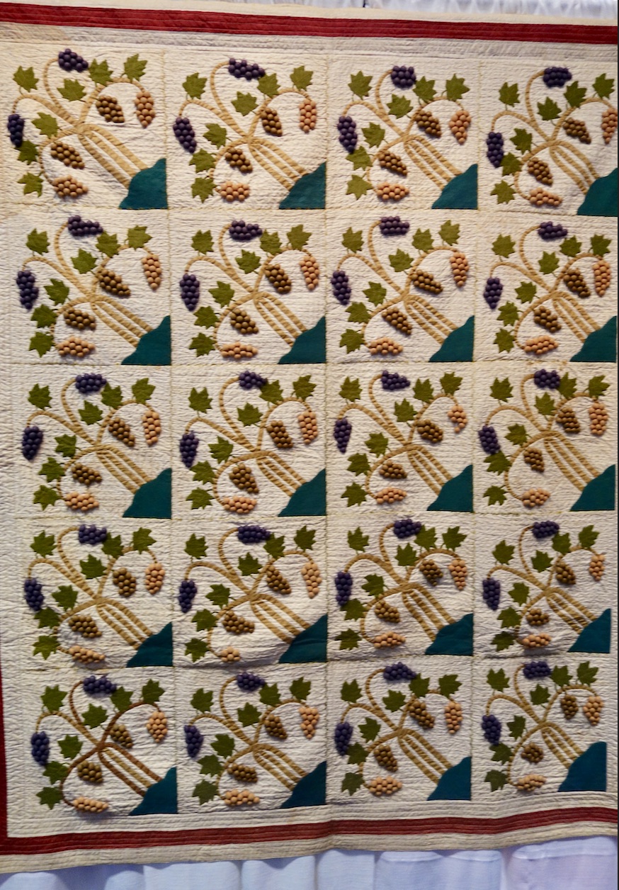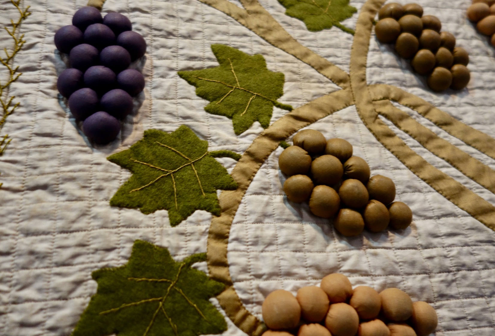 To me, it looks like grapes were YoYo's, stuffed tightly and then sewn onto the quilt. How else could the grapes be so 3 dimensional?