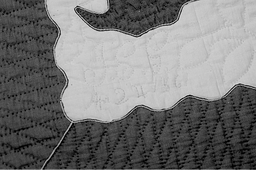 Rose and Oak Leaf quilt detail of TTUH 1986-045 made by Jane Eliza Gardner donated by her grandson James C. Holland, showing machine chain stitching around applique edges and the initials JEG and the date April 24, 1861. Photo courtesy of the Museum of Texas Tech University.