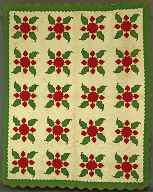 The Rose and Oak Leaf appliqued quilt in the Clothing and Textile Collection of the Museum of Texas Tech University is machine appliqued and bears a date of April 24, 1861 and the initials JEG which were embroidered with white thread along the lower edge. This is a nice example of an early use of the sewing machine in quilting. The quilt was made near Murray, Kentucky by Jane Eliza Gardner, born Nov. 23, 1841 and died April 1919. At the age of 20, Jane married James M. Williams on December 5, 1861. The family tradition says that the hearts in the quilting design indicates it was made as a wedding quilt. Following are detail images of the quilt and the machine applique work.