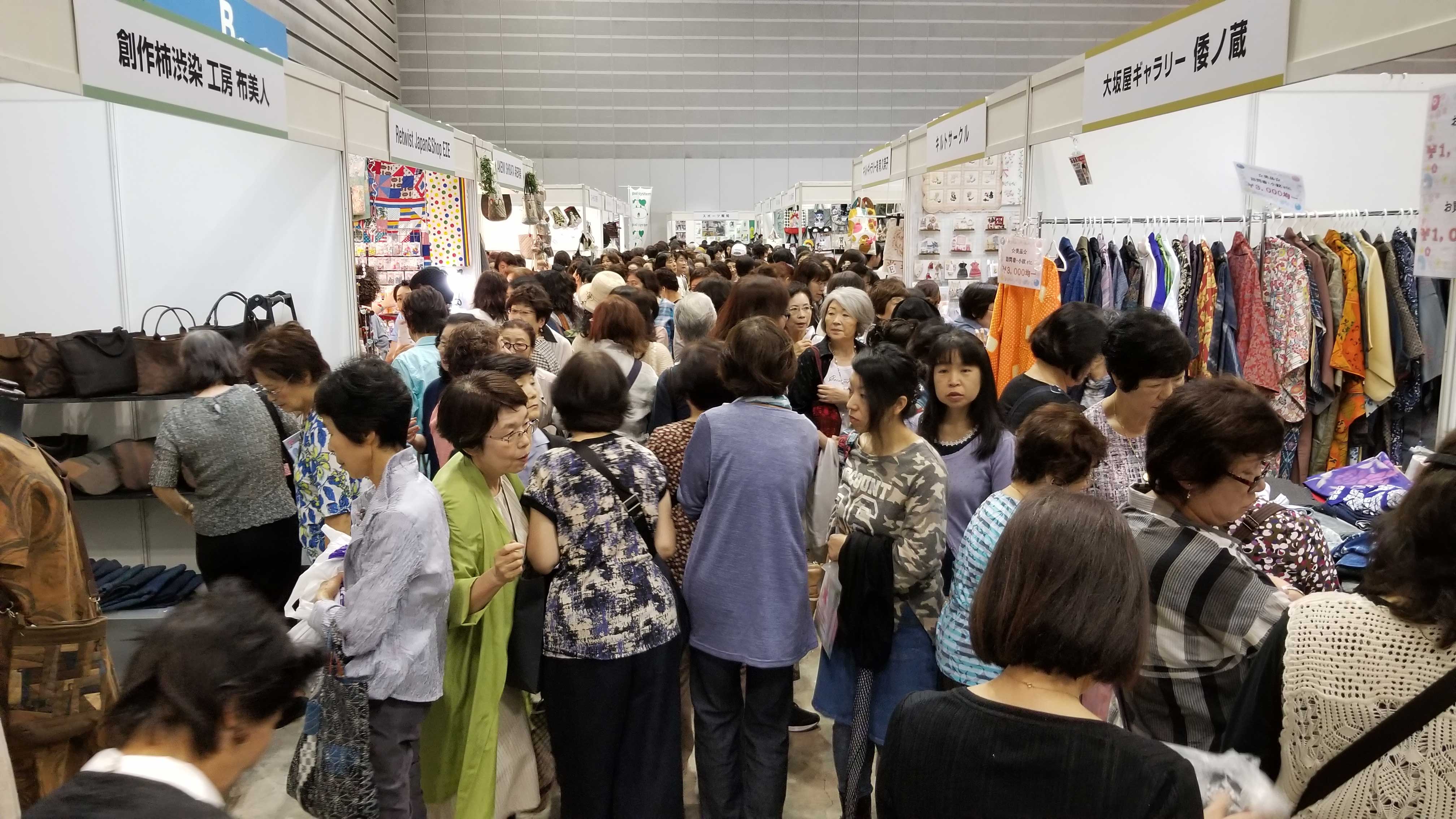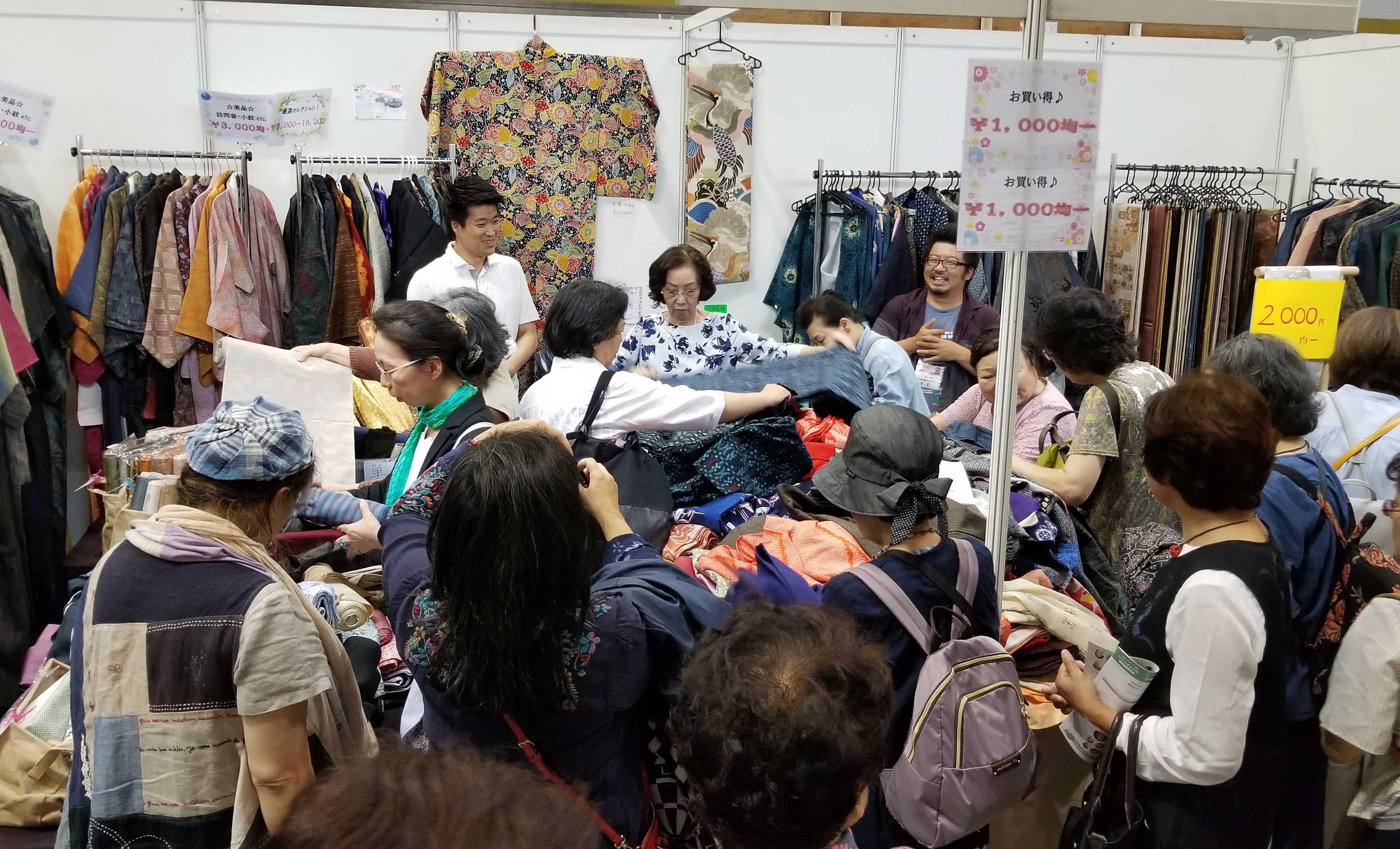 One of the best treats at a Japanese quilt festival is the opportunity to shop for antique fabric, such as these silk and cotton kimonos. Many quilters will cut them apart and use them for quilts. This booth is packed with shoppers, perhaps the 1,000 Yen price (roughly $10.00 USD) was a big attraction.