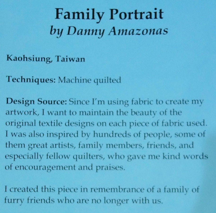 If you are not familiar with the work of Danny Amazonas, let us introduce you to one of his stunning pieces. Family Portrait was created as a remembrance of a family of furry friends that are no longer with us. If you love your pets, this might bring a tear to your eye. The quilt was on exhibit in Houston 2017.