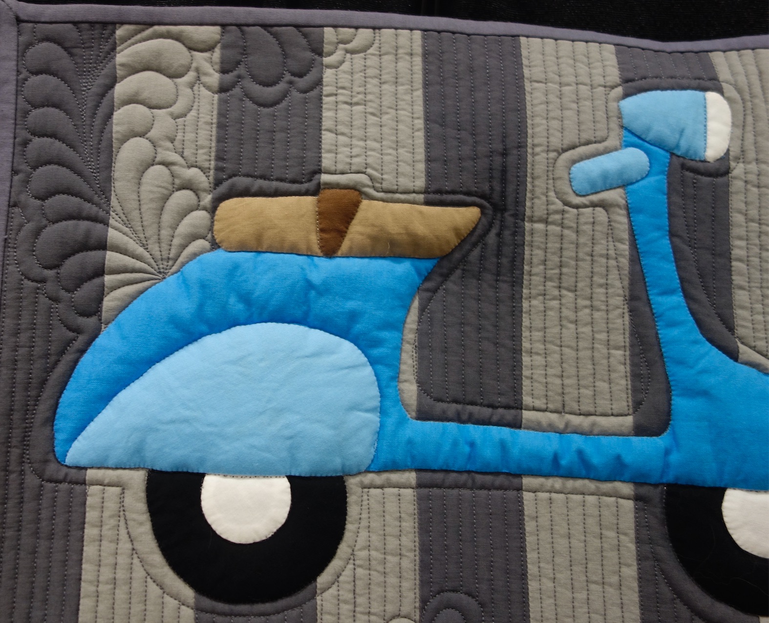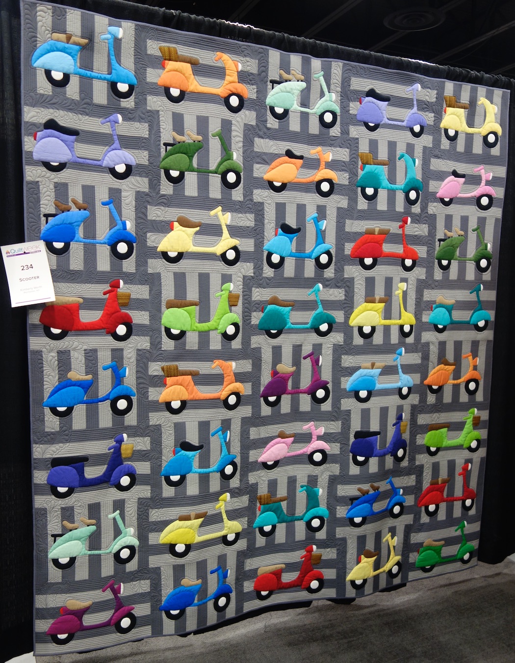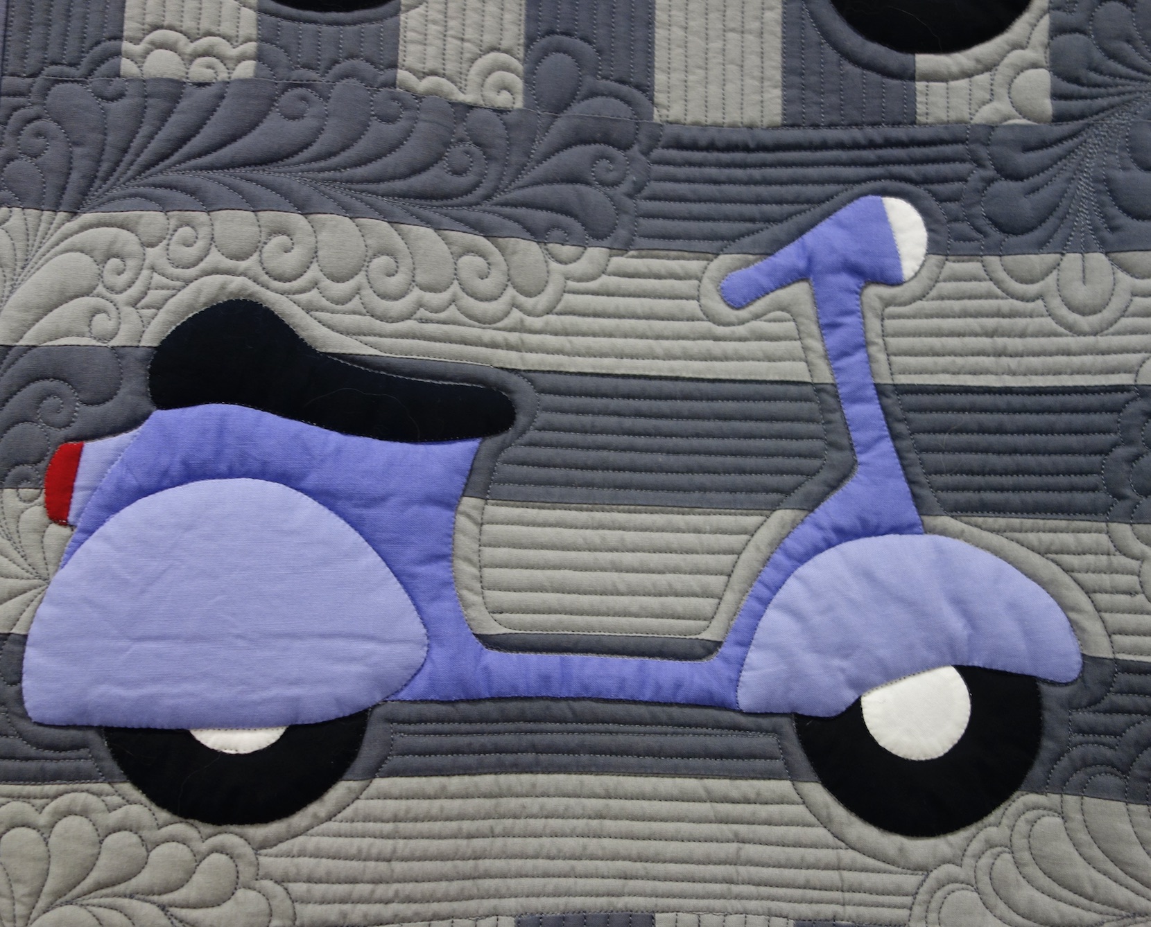 Enjoy the whimsical charm and technical detail of Scooter by Kimberly Werth. The colorful appliqué is enhanced by stunning quilting, particularly the exhaust...
