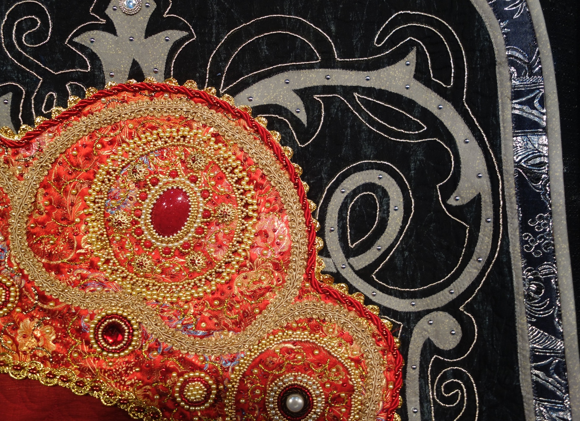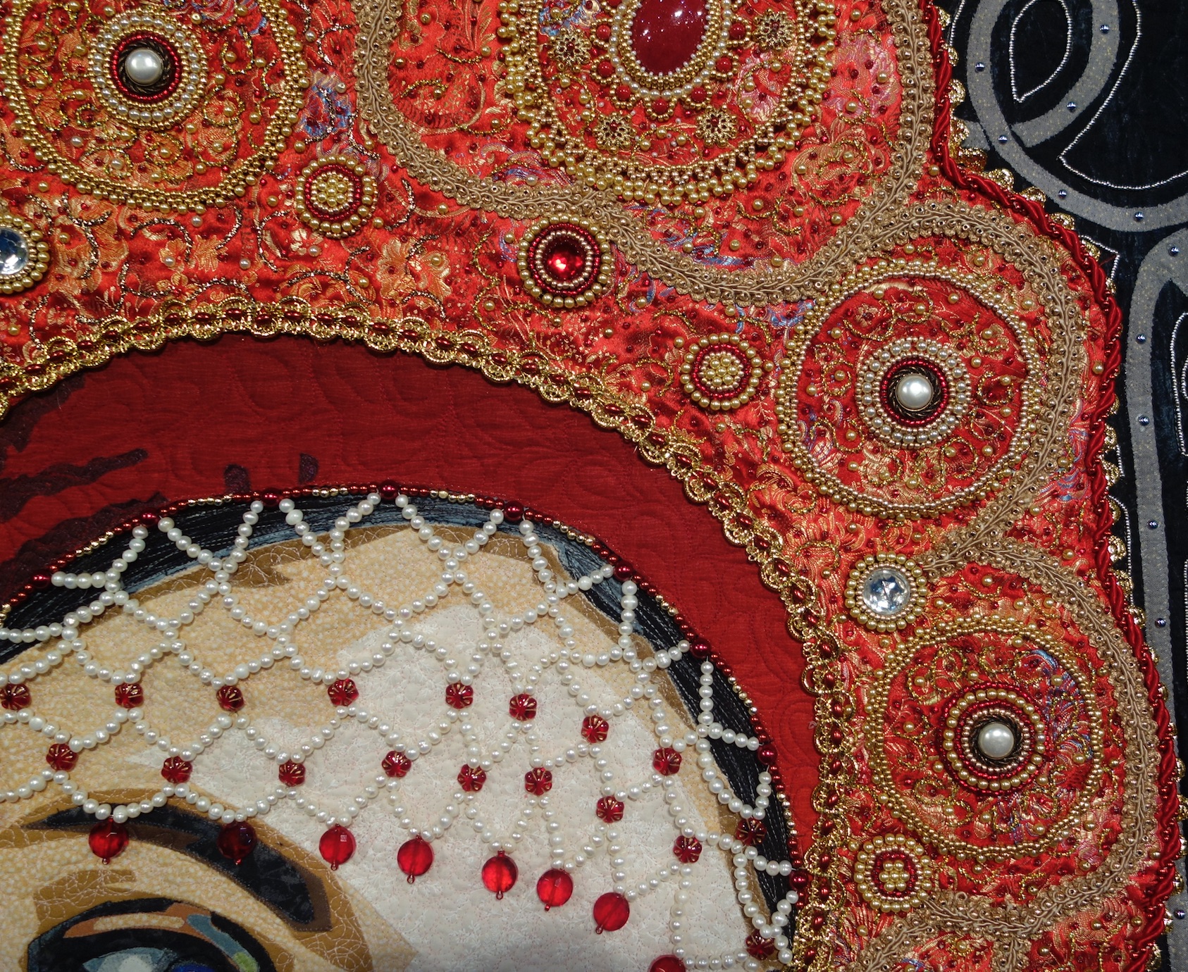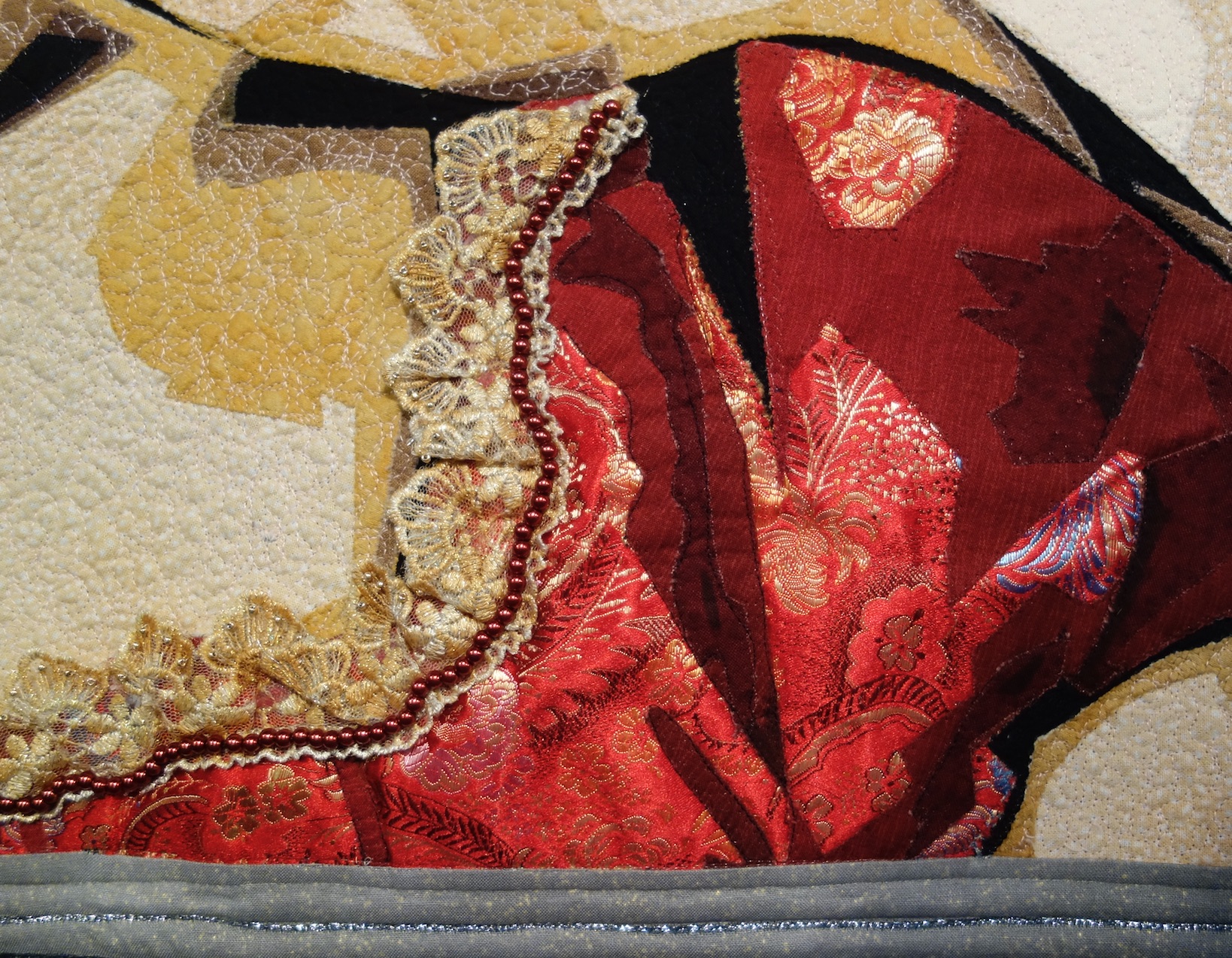 Kay's amazing quilt, Somewhere My Love, was exhibited at the Houston Quilt Festival in 2017. It was created with cotton and synthetic fabrics, lace, ric rac, various trims, and buttons. And, are you sitting down?...It was embellished with approximately 15,000 hand-sewn beads.