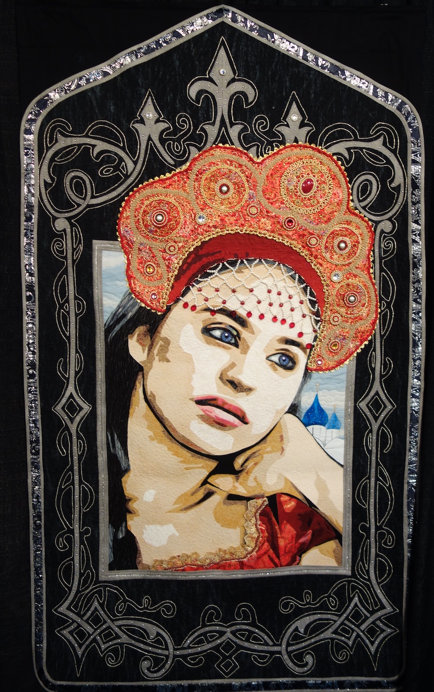 "In 2016, I was invited to do a trunk show and lecture at the Russian International Quilt Festival in Suzdal, Russia. The theme of the festival was Love. There were reenactments of weddings from different areas and periods of history. The title of the quilt is from "Lara's Theme" from the movie, Doctor Zhivago. The subject is a Russian bride dressed in traditional Russian clothing. The building behind the bride is the dome of the Church of the Nativity, which dates back to 1528. I have dedicated this quilt to the loving and gracious Russian quilters."