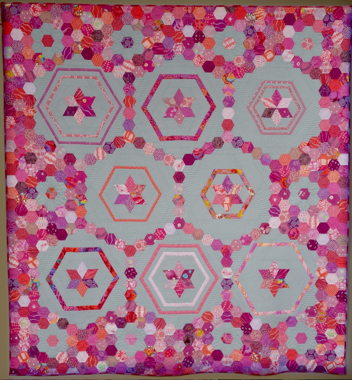 Patty's quilt, The Bride Work Pink, is all machine pieced and is based on an antique quilt she saw at the International Quilt Study Center & Museum. Patty created her version of the quilt by substituting hexagons for some of the original blocks.