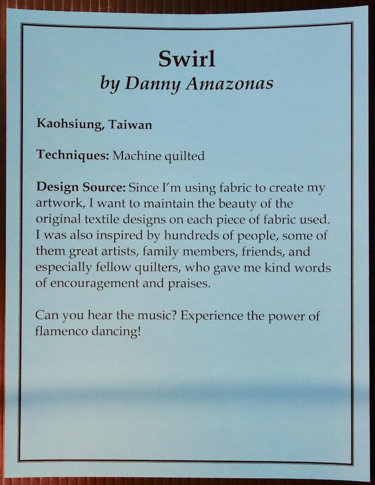 Danny Amazonas' quilt, Swirl, makes you see the movement and feel the rhythm of the Flamenco dancer's hands and feet. Take a look at how he takes flat, colorful little bits of fabric and brings the dancer to life.