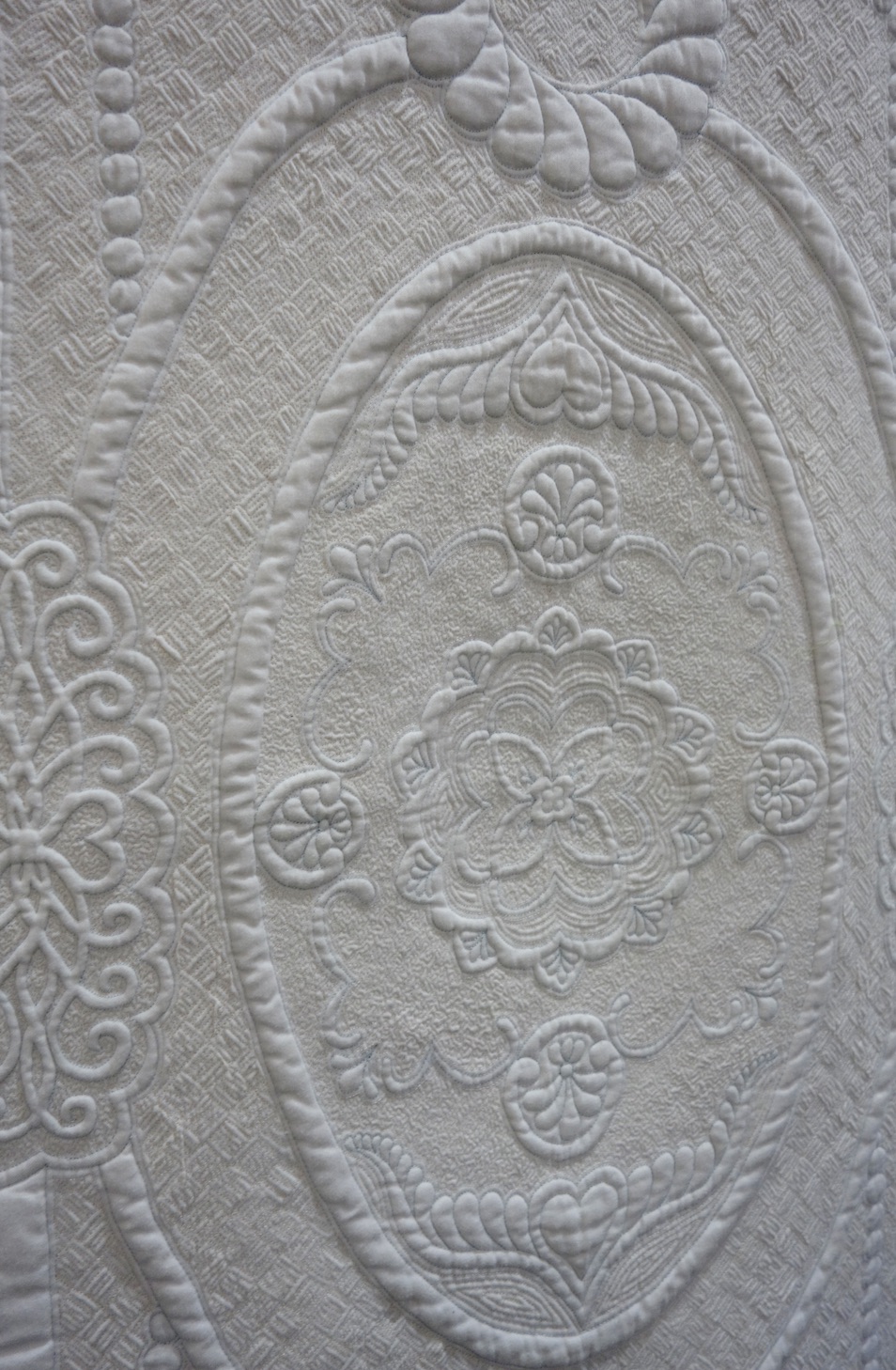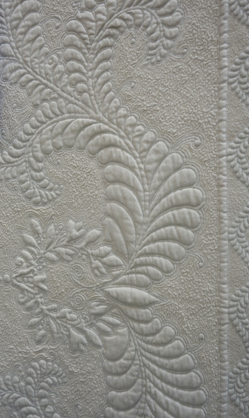 My first wholecloth was a king sized (110 x 96) reversible tan to cream with matching reversible zippered pillow shams. I did it on my Gammill Classic plus all hand guided with my original design.