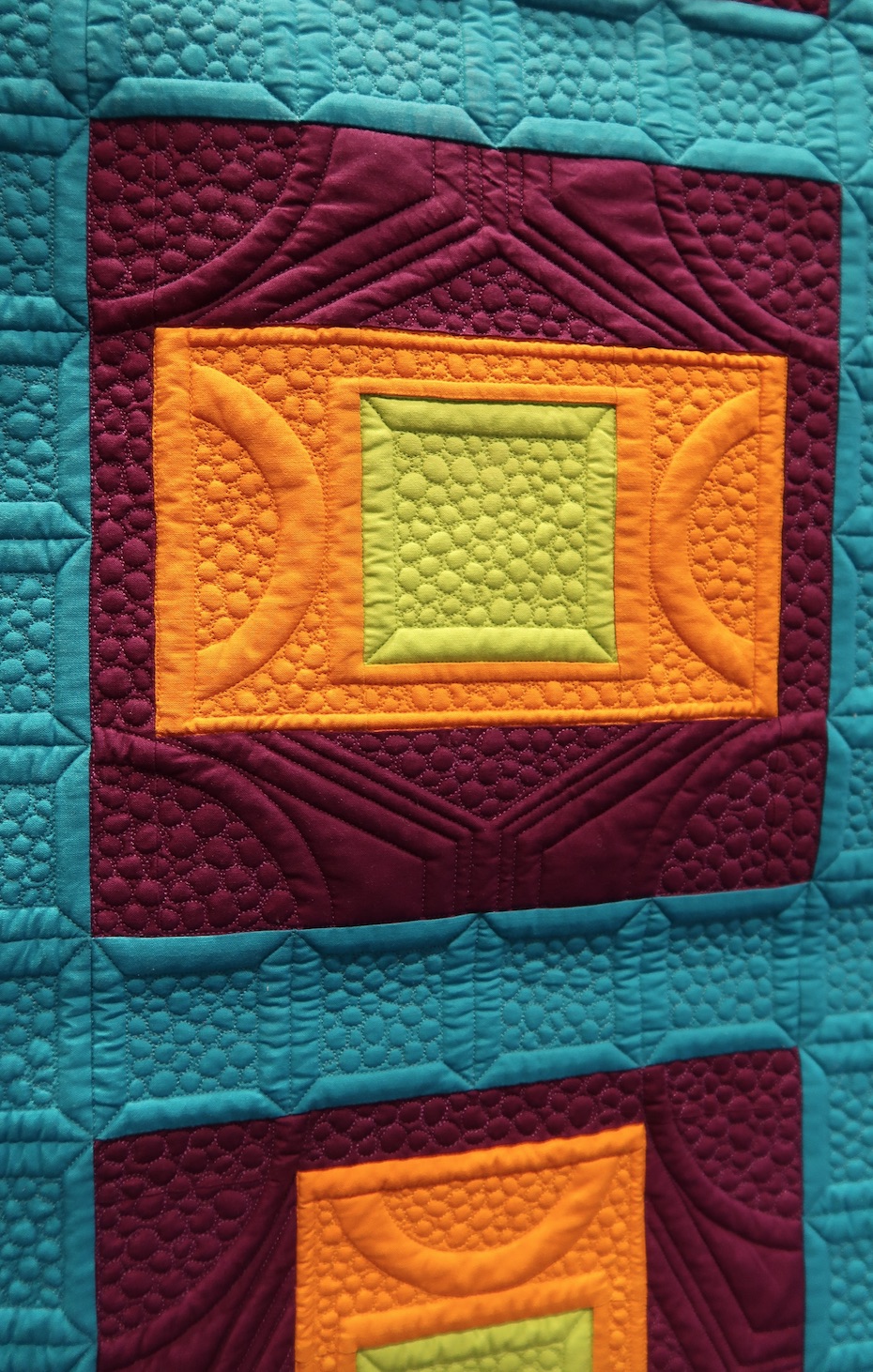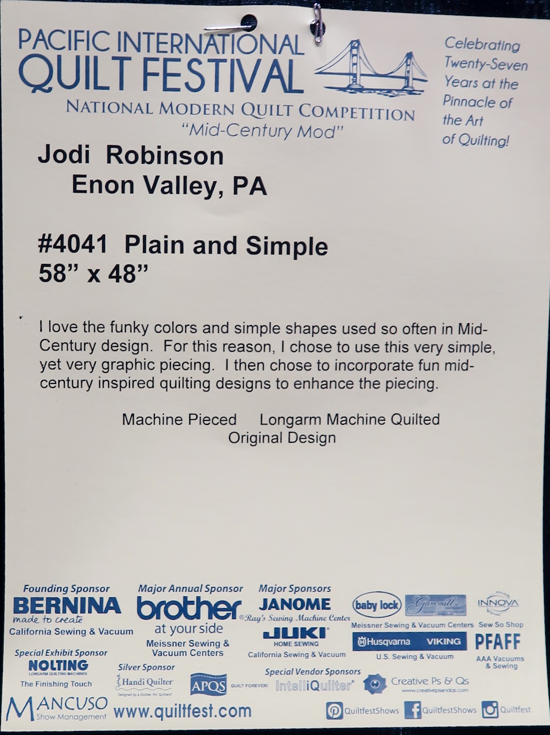 Plain and Simple by Jodi Robinson won Best Mid-Century Modern at the Pacific International Quilt Festival 2018. It does not look that "simple" to us. The piecing is graphic and the quilting divine.