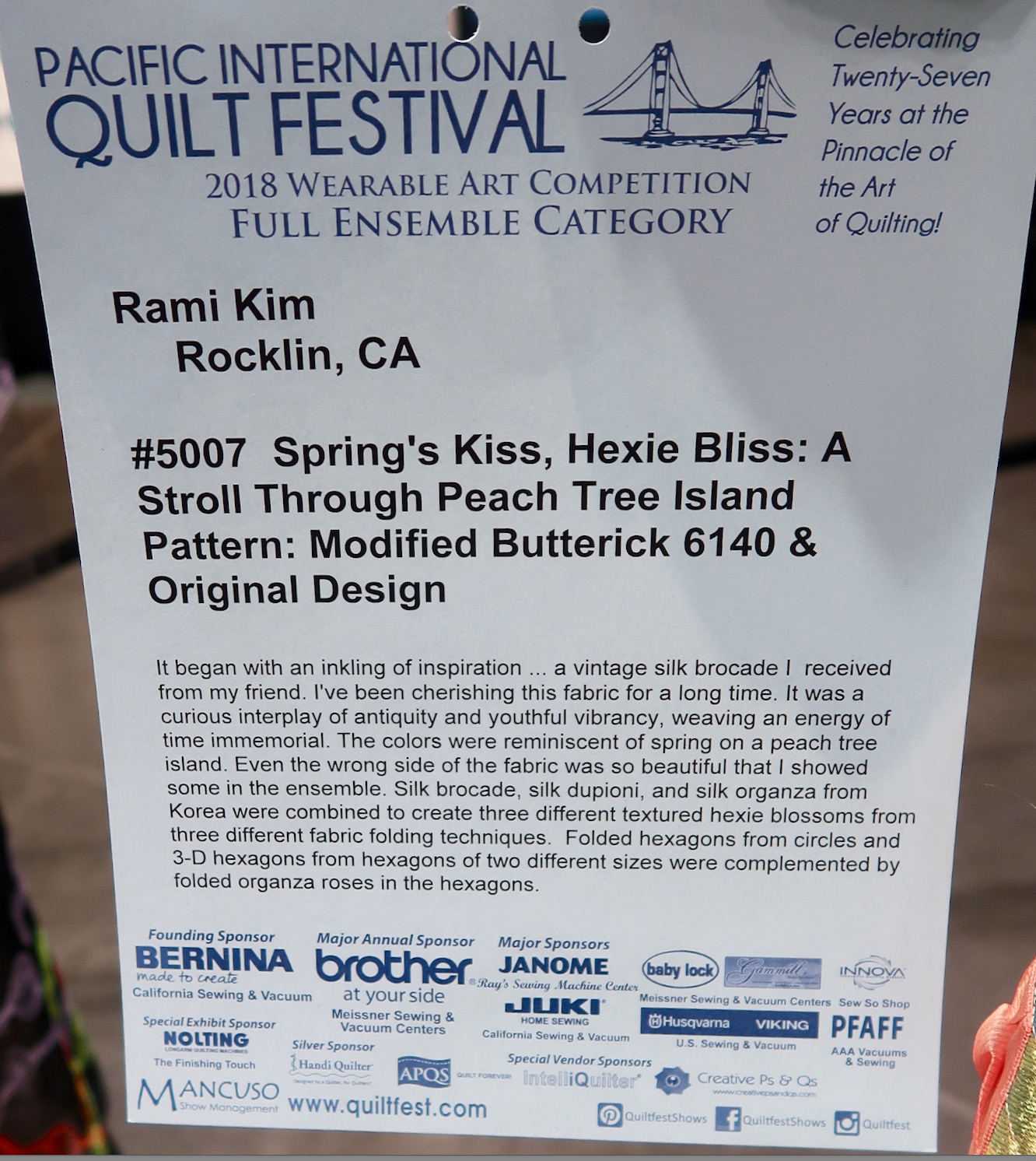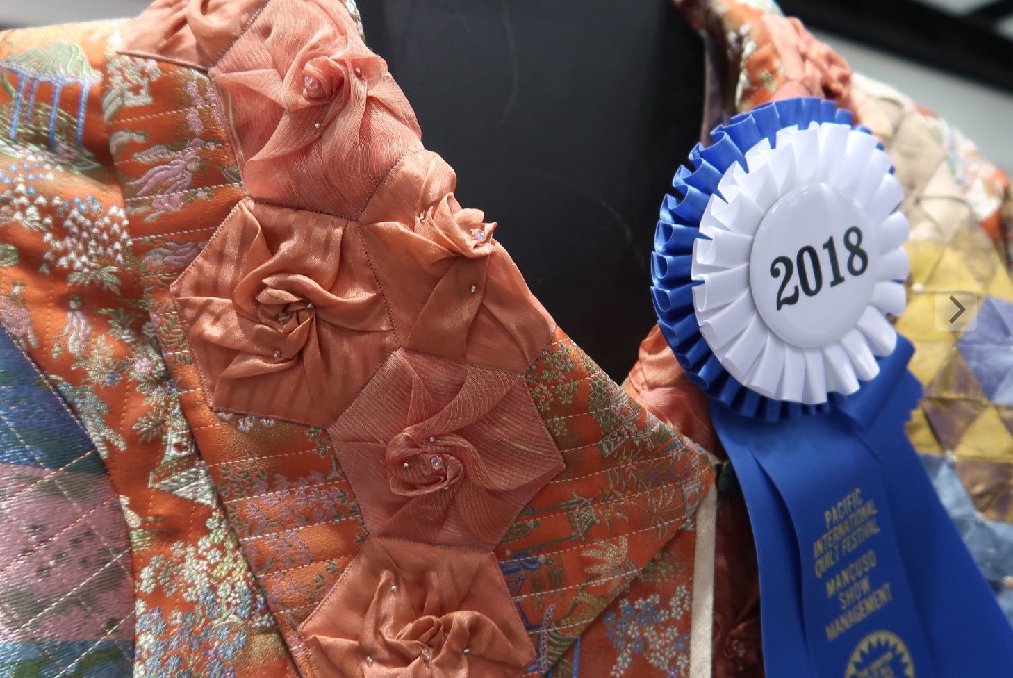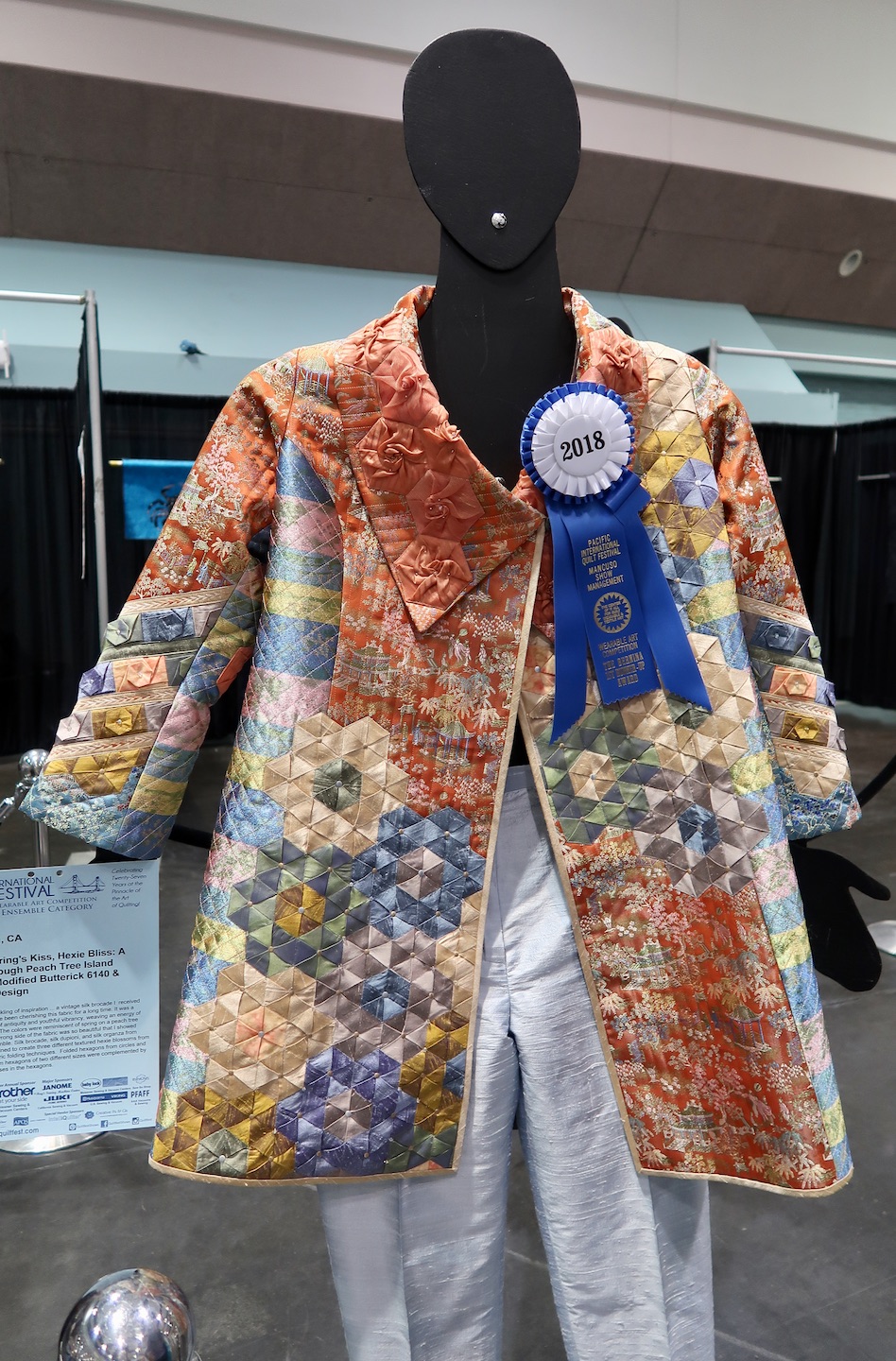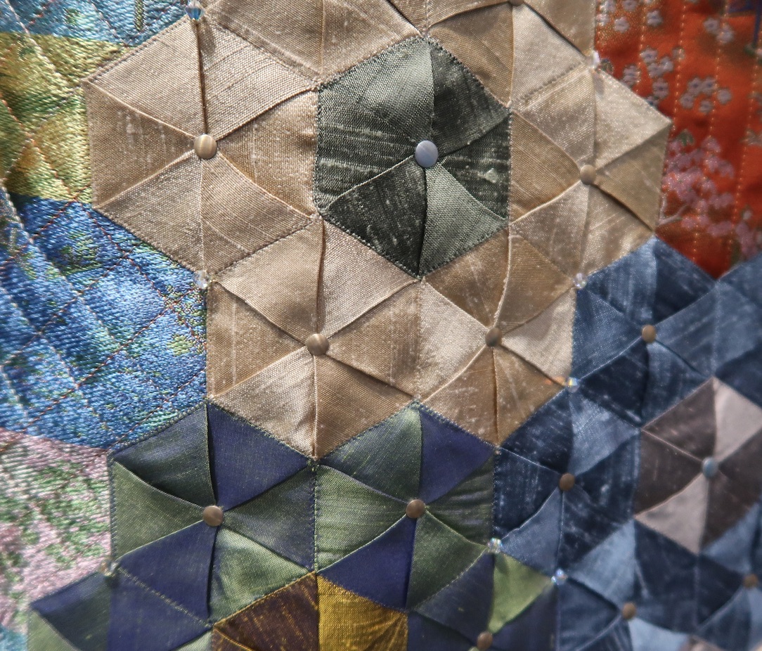 We weren't surprised to see Rami Kim's enchanting ensemble win the BERNINA 1st Runner Up award at PIQF. She used a beautiful silk brocade that she'd been cherishing for a very long time. She found it so beautiful, she even used some of the wrong side of the fabric. She also used three different fabric folding techniques to create the hexagons in the design. Enjoy Spring's Kiss, Hexie Bliss: A Stroll Through Peach Tree Island.