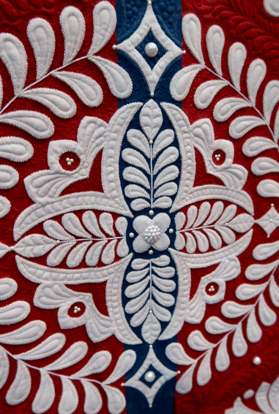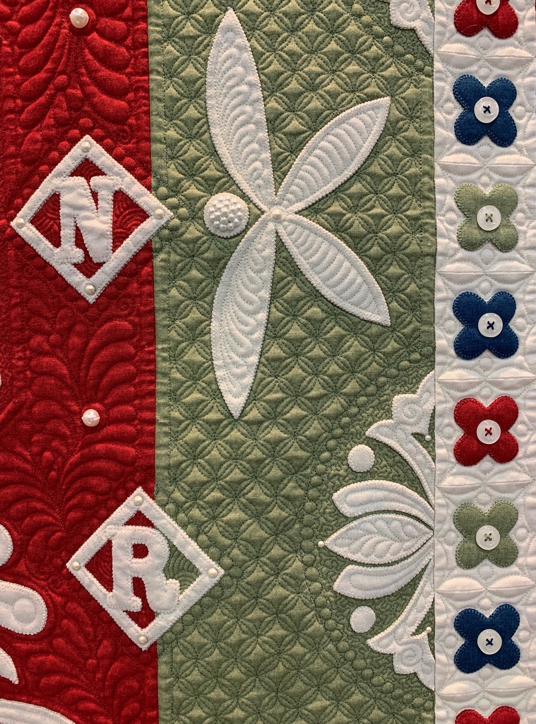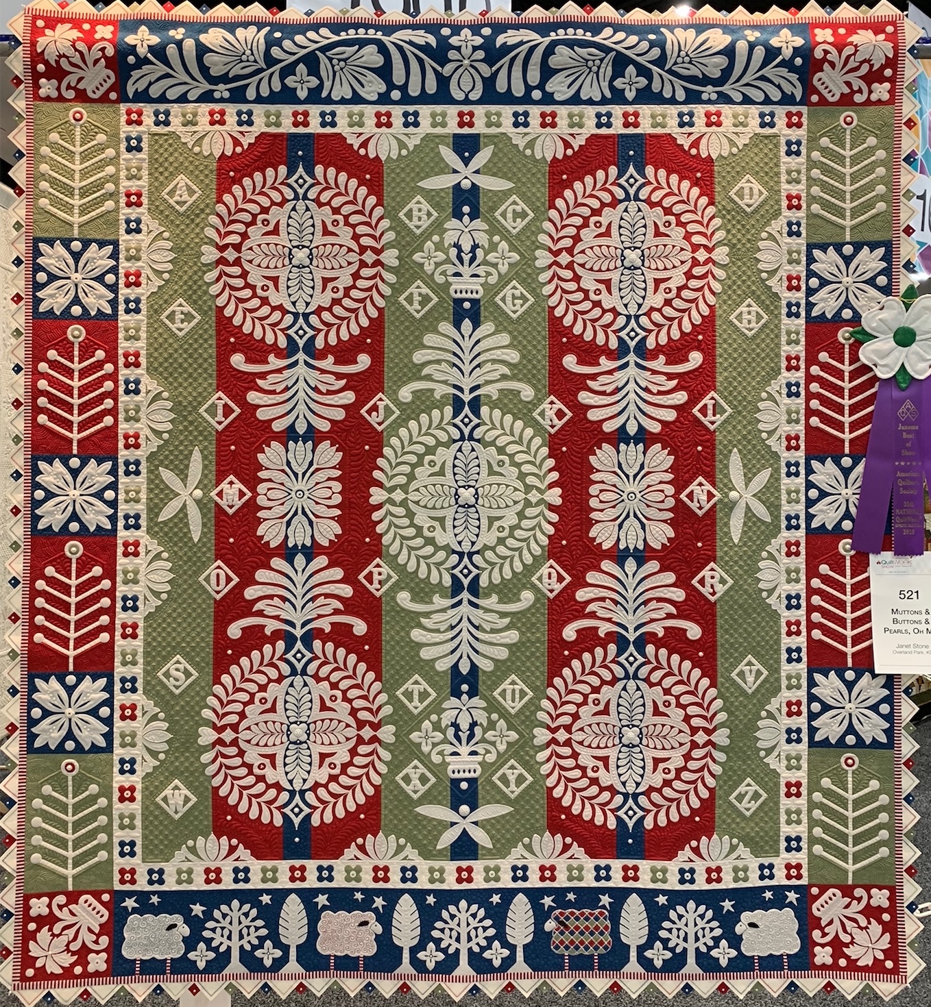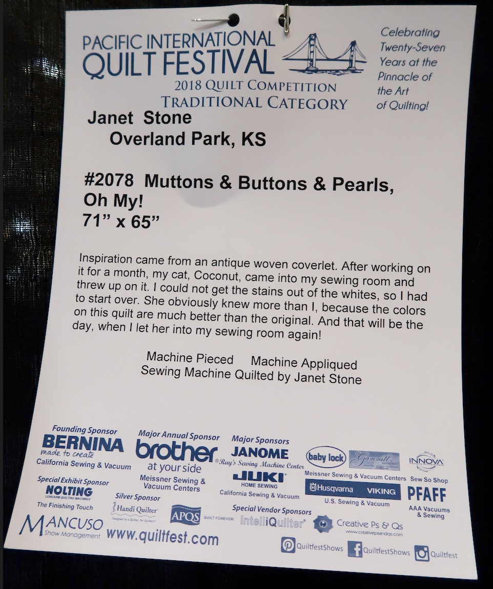 Muttons & Buttons & Pearls, Oh My! won Best Stationary Machine Quilting at AQS Lancaster 2019.