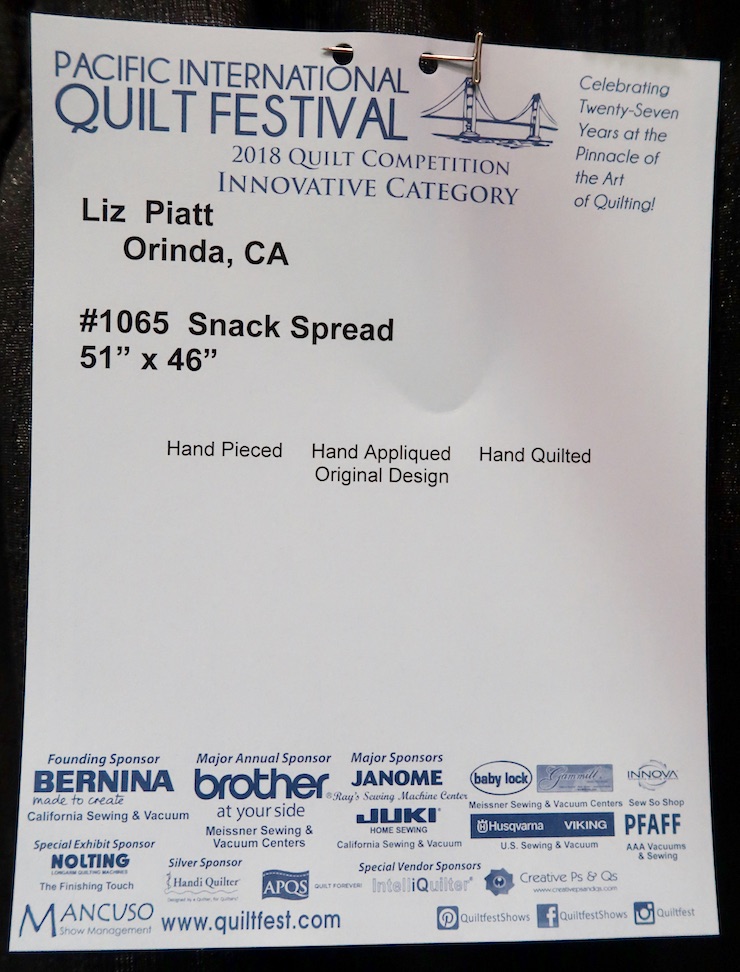 Snack Spread by Liz Piatt won Best Interpretation of Theme Innovative at the Pacific International Quilt Festival 2018. The theme was "That'll Be The Day When" ... You Finish the Sentence. We aren't exactly sure what Liz was thinking of when she made this "mouth-watering" quilt, but we want to be there when it's THAT DAY!