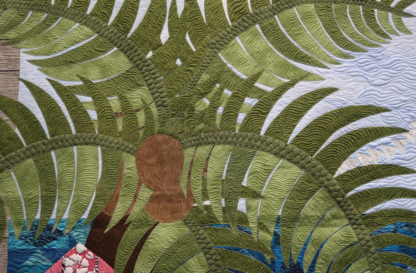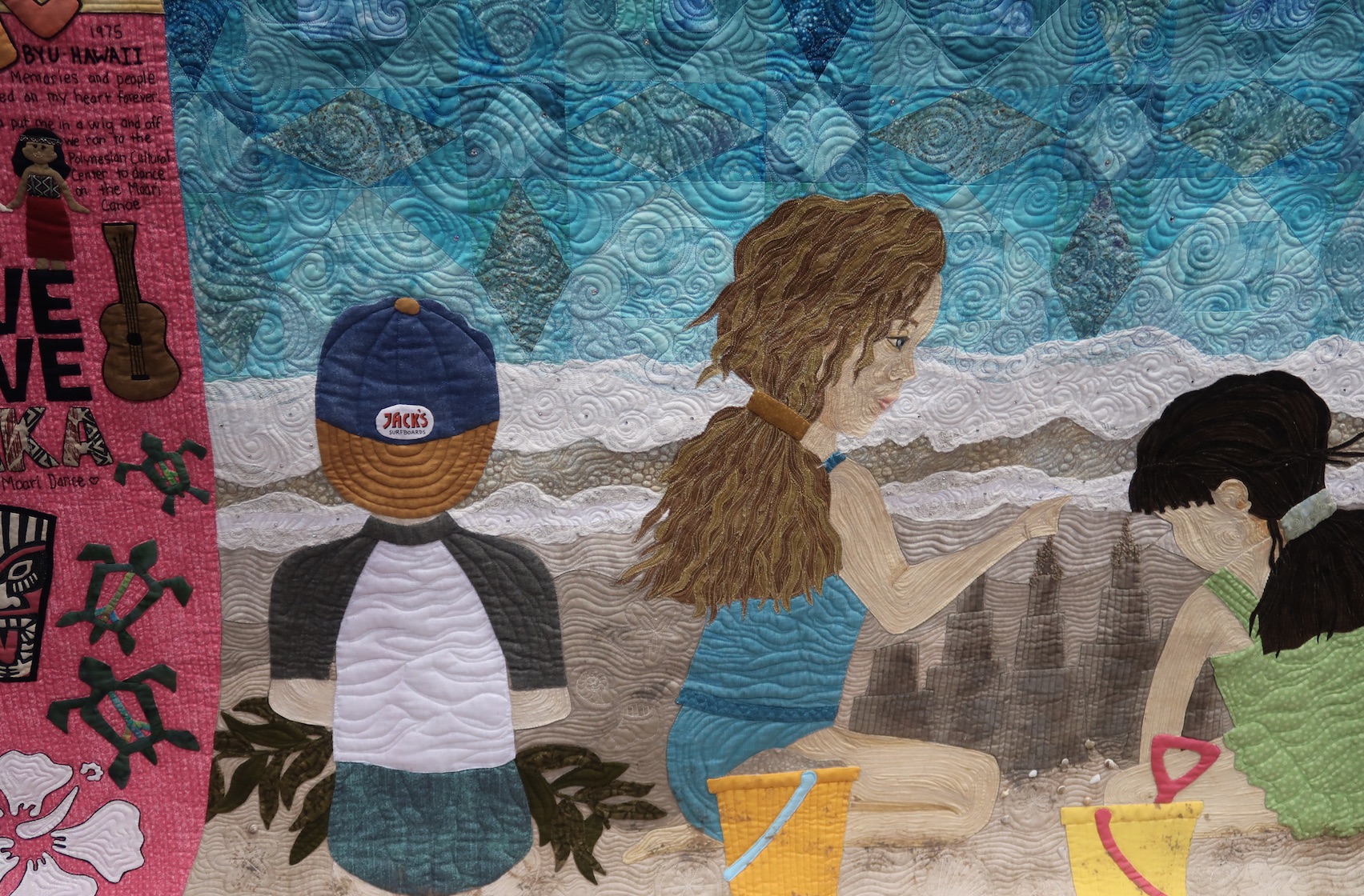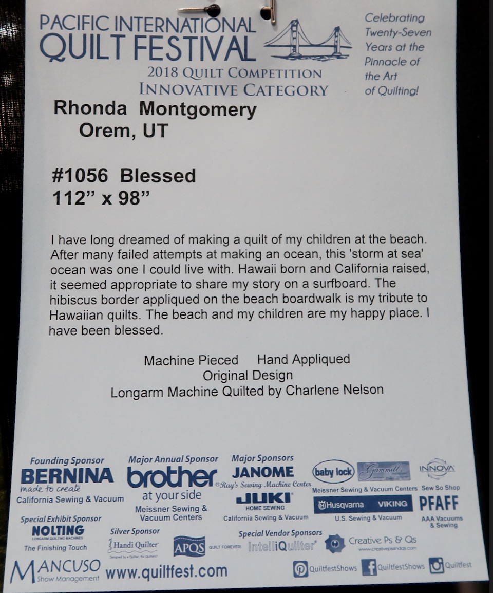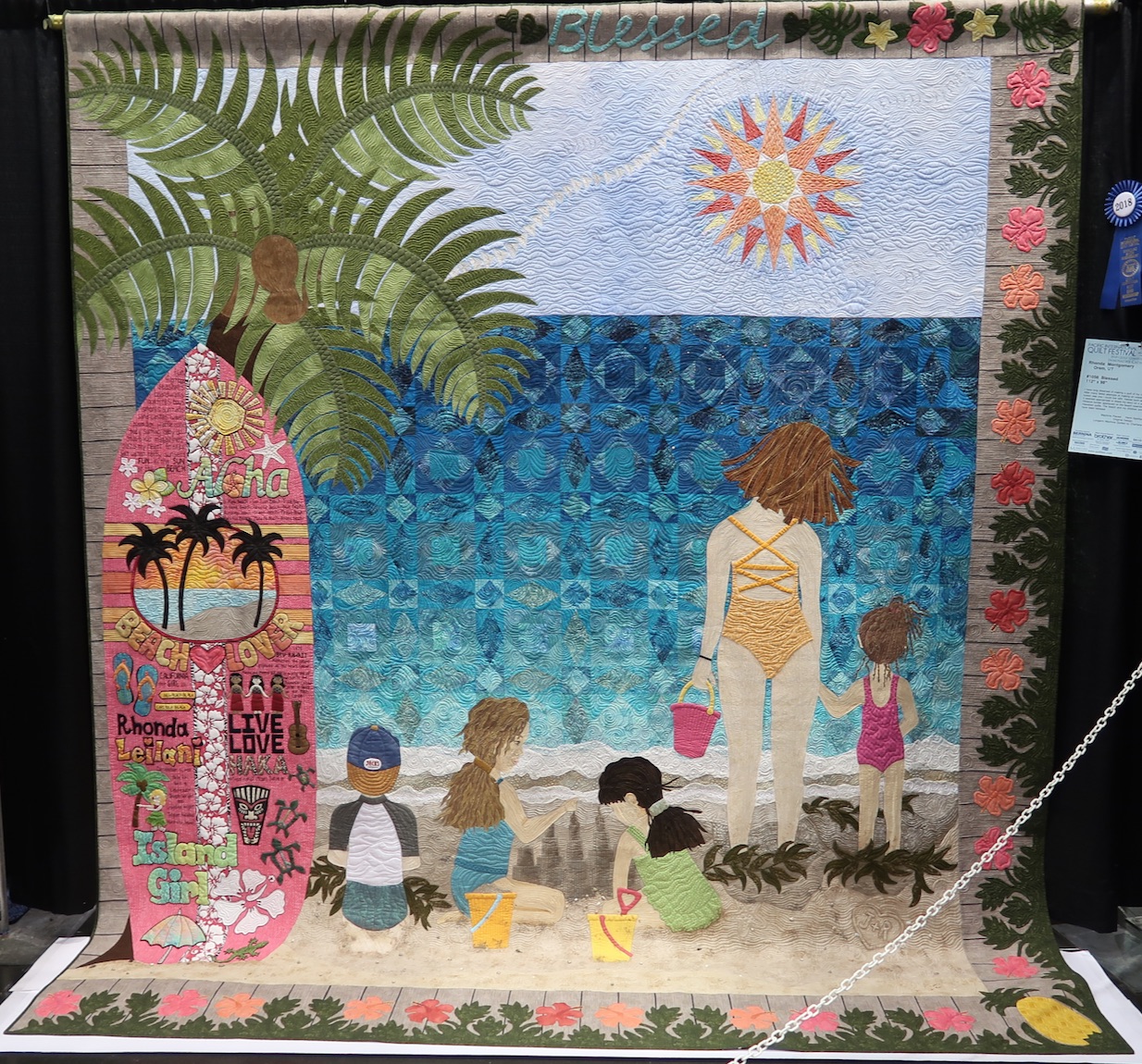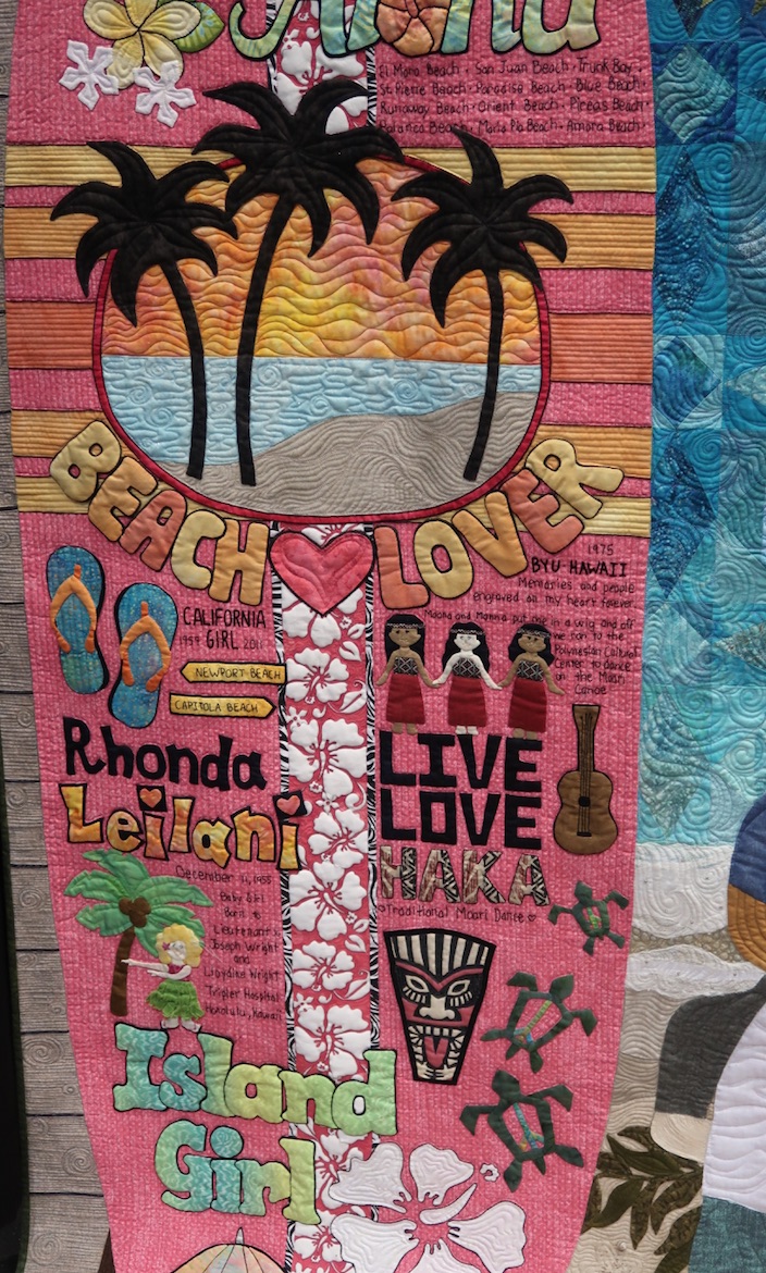 Born in Hawaii and raised in California, Rhonda Montgomery's 'happy place' is on the beach with her children, so she made a quilt of her children at the beach. She found it appropriate to share her story on the appliquéd surfboard and used "storm at sea" to create her ocean. The hibiscus border is her tribute to Hawaiian quilts.