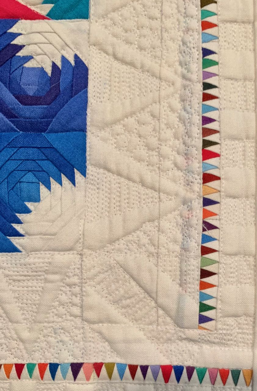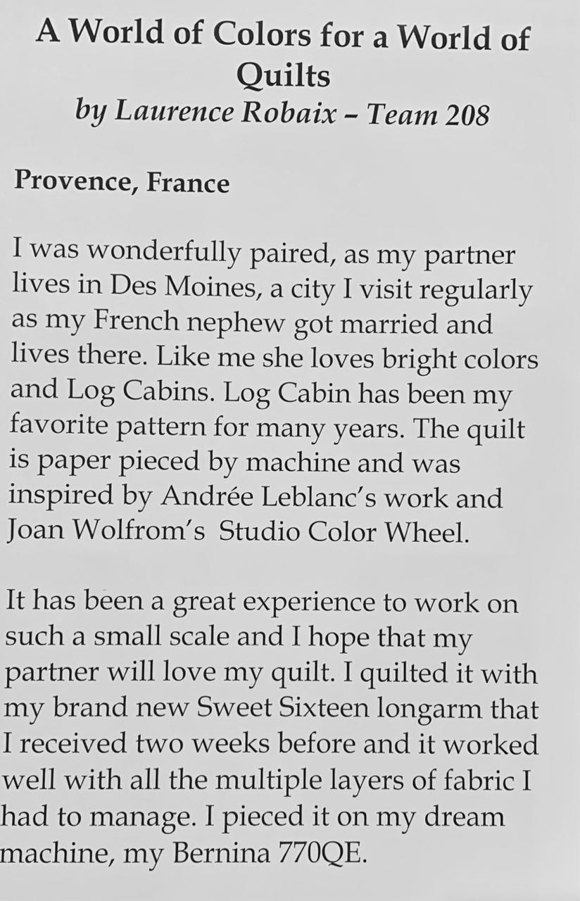 The International Miniature Quilt Exchange (IMQE) was an exhibit and exchange sponsored by TheQuiltShow.com. It was displayed at the Houston Quilt Festival 2018. The quilts and the stories were wonderful. We met Laurence Robaix from Provence, France whose quilt, A World of Colors for a World of Quilts, was in the exchange. She explained that the border took her two months to complete.