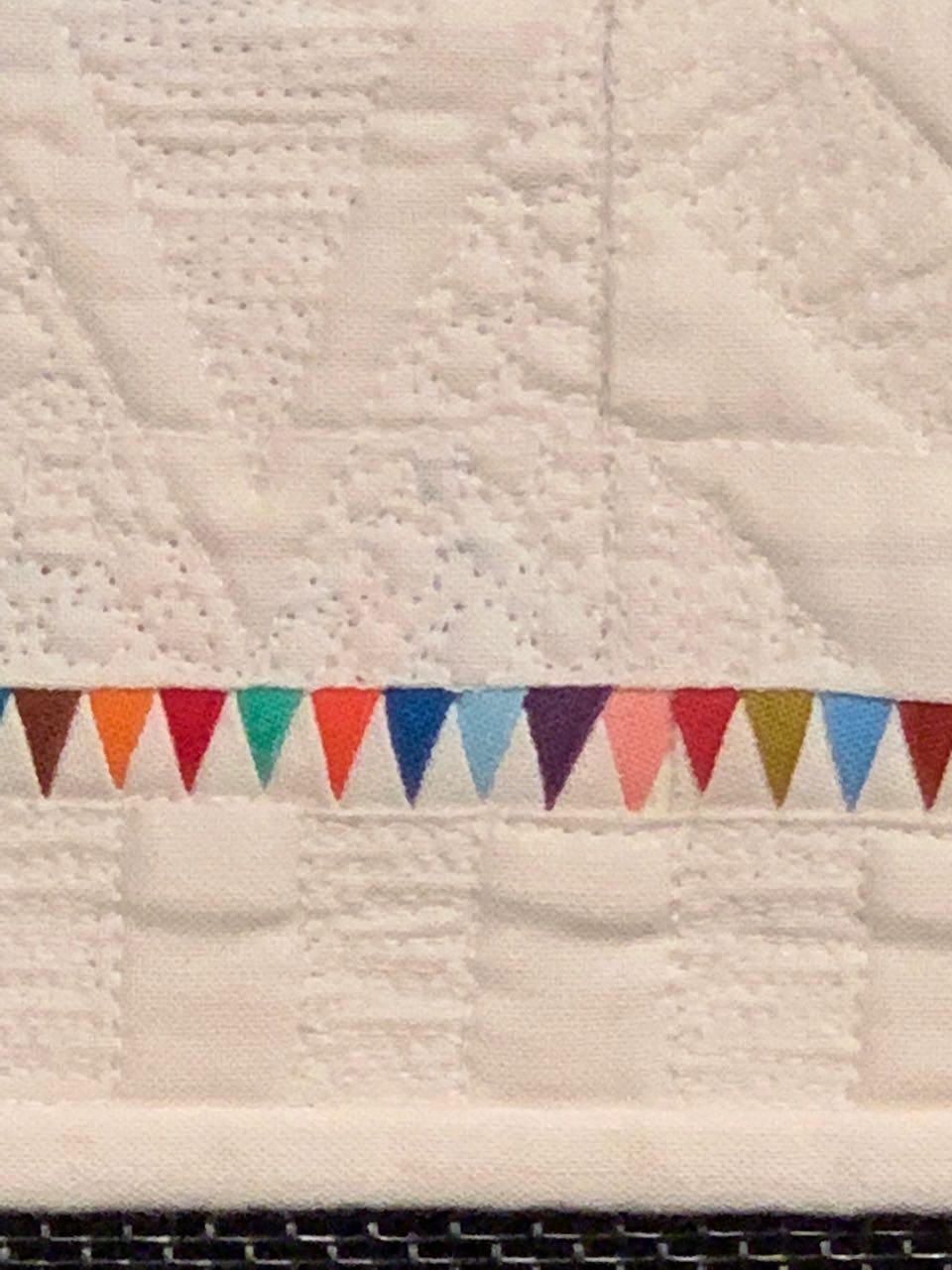 It is pieced, not painted or a piece of fabric.......AMAZING! Each quilt had to be no less than 18" and no more than 24" on any side. That makes the triangles about...hmmmm...well take a look.