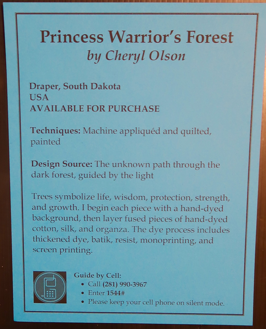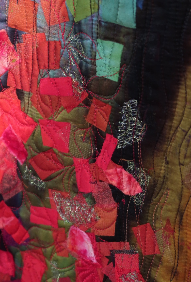 Cheryl hand-dyed her background and then layered on fused pieces of hand-dyed cotton, silk, and organza. The dye process includes thickened dye, batik, resist, monoprinting, and screen printing.