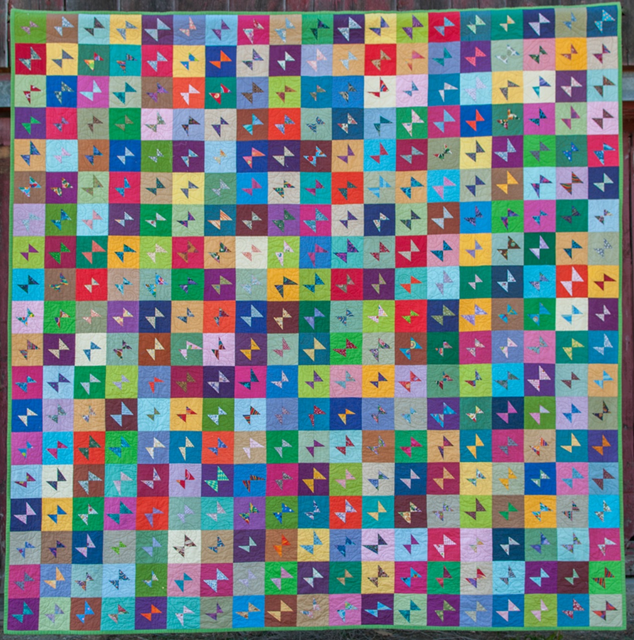 She went through her solid stash and cut squares in groups of four from each color. It took four squares to make each butterfly block. She was very happy when this large, 95" x 95", quilt was finally on her bed.