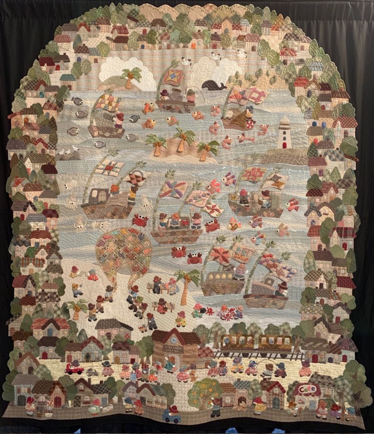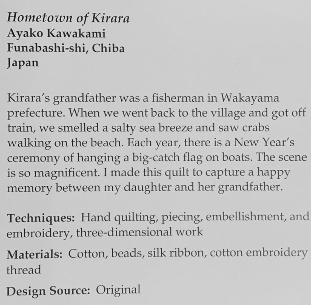 Hometown of Kirara by Ayako Kawakami was part of the Appliqué, Large, section of the Houston International Quilt Festival. Kirara's grandfather was a fisherman. The quilt recreates a magnificent New Year's ceremony of hanging a "big-catch" flag on boats.