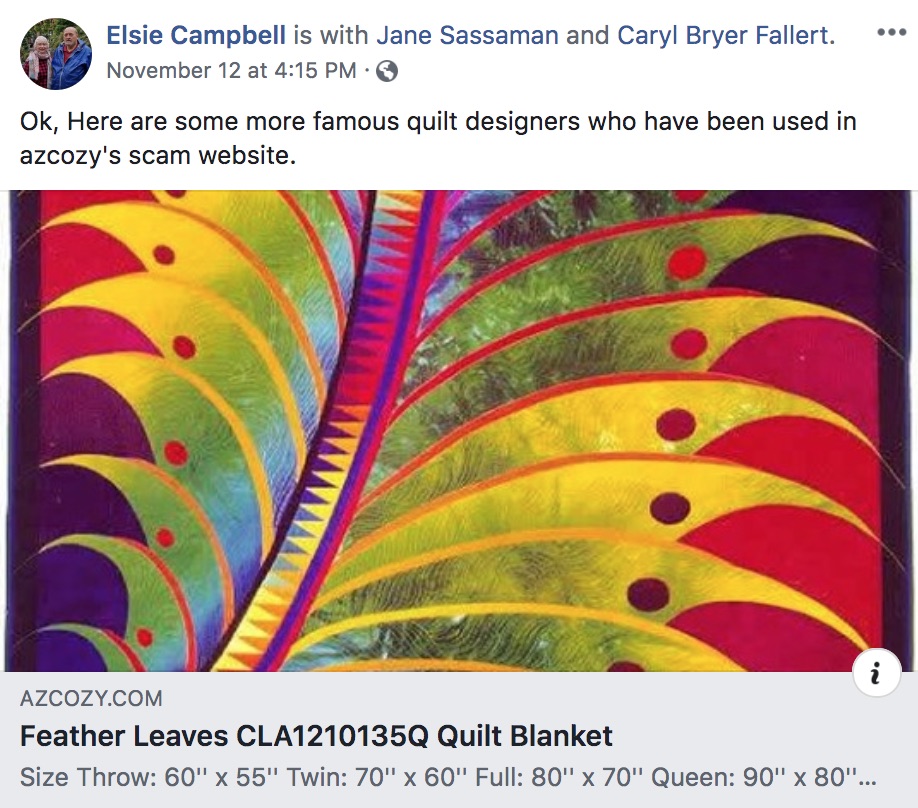 We reported this about one year ago today and have discovered it is still happening on another site. Designs by Caryl Bryer Fallert-Gentry, Elsie Campbell, Jane Sasssaman and more have been stolen. Click here for more information.