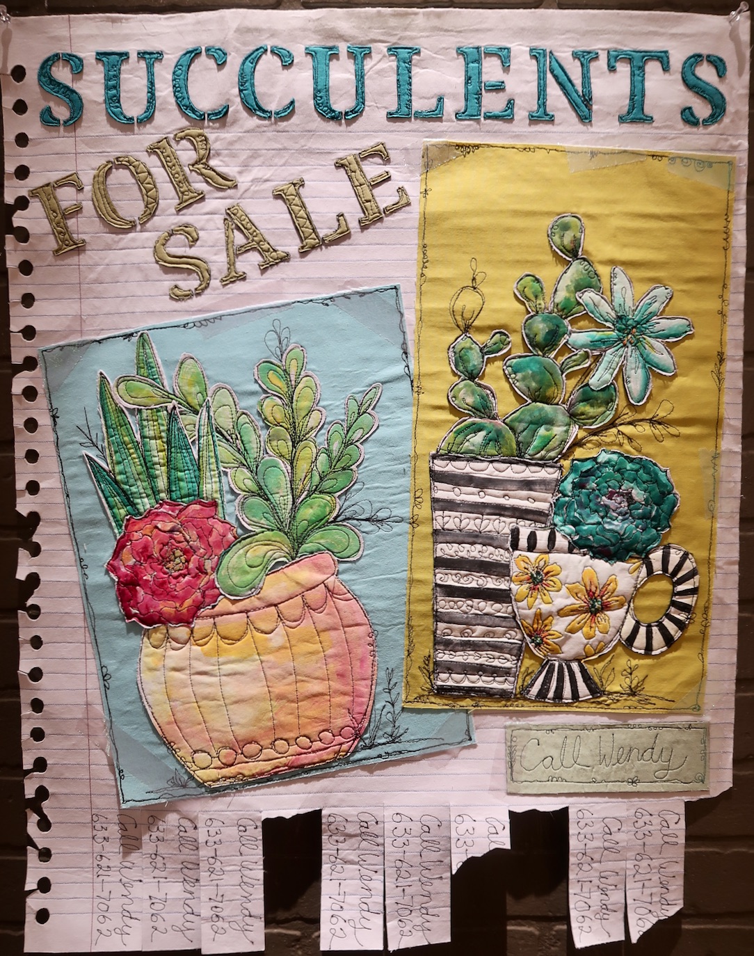 Libby wanted to recreate a piece of notebook paper with this quilt. It looks just like it right down to the hole punches and bits of "tape" holding on the images.
