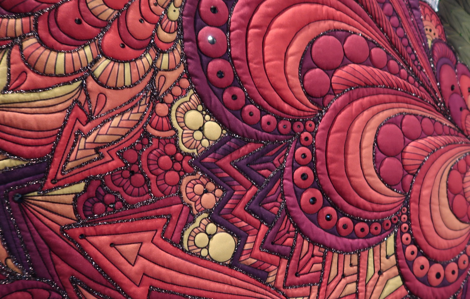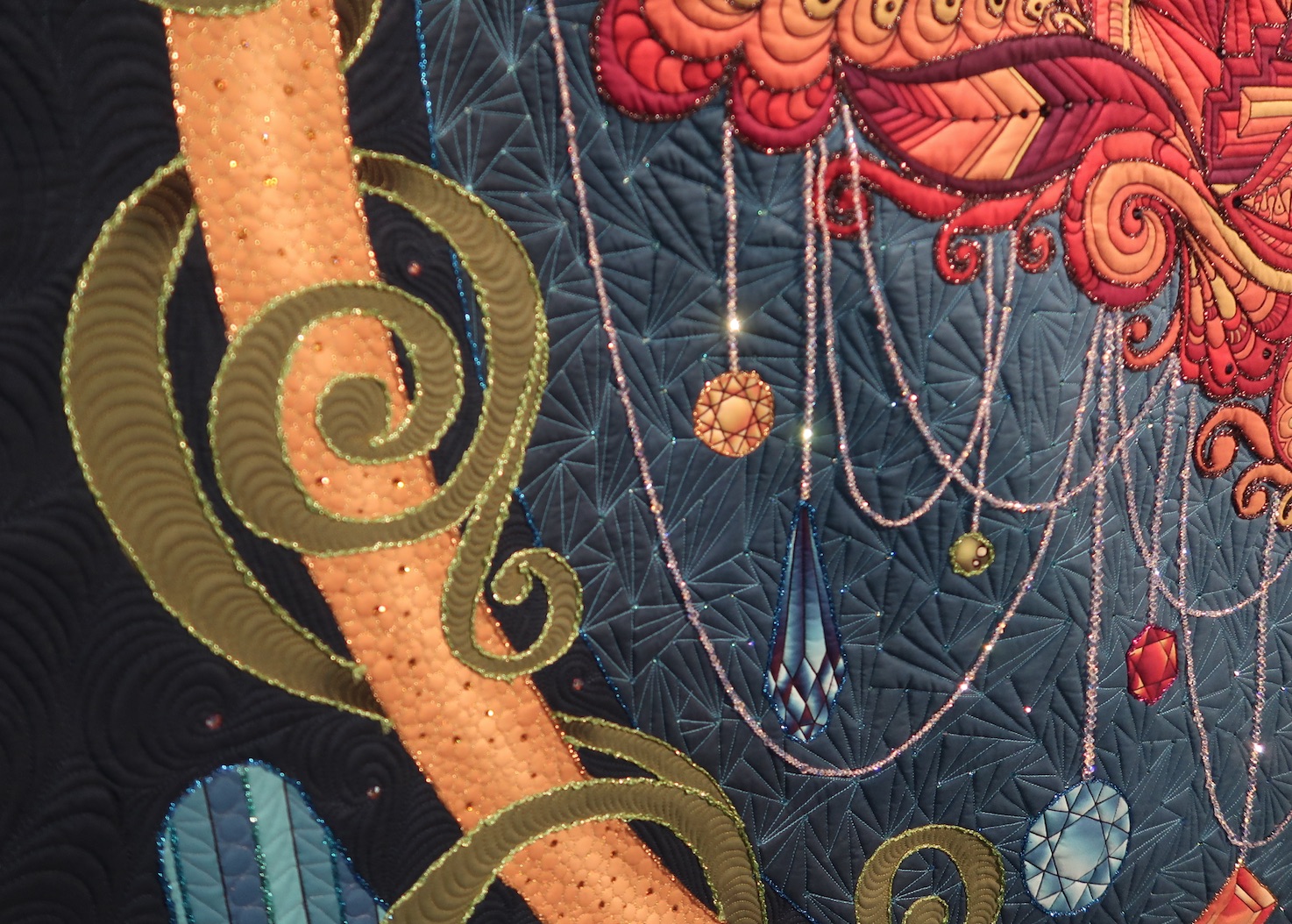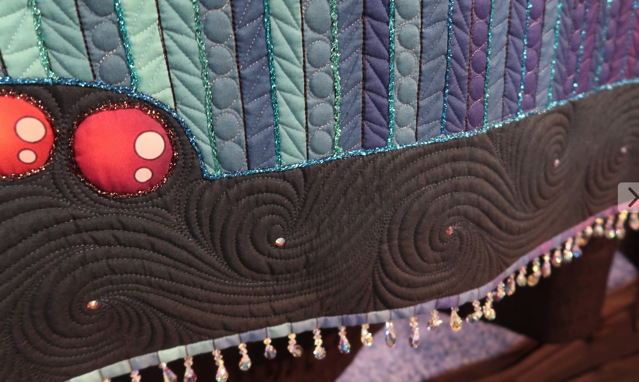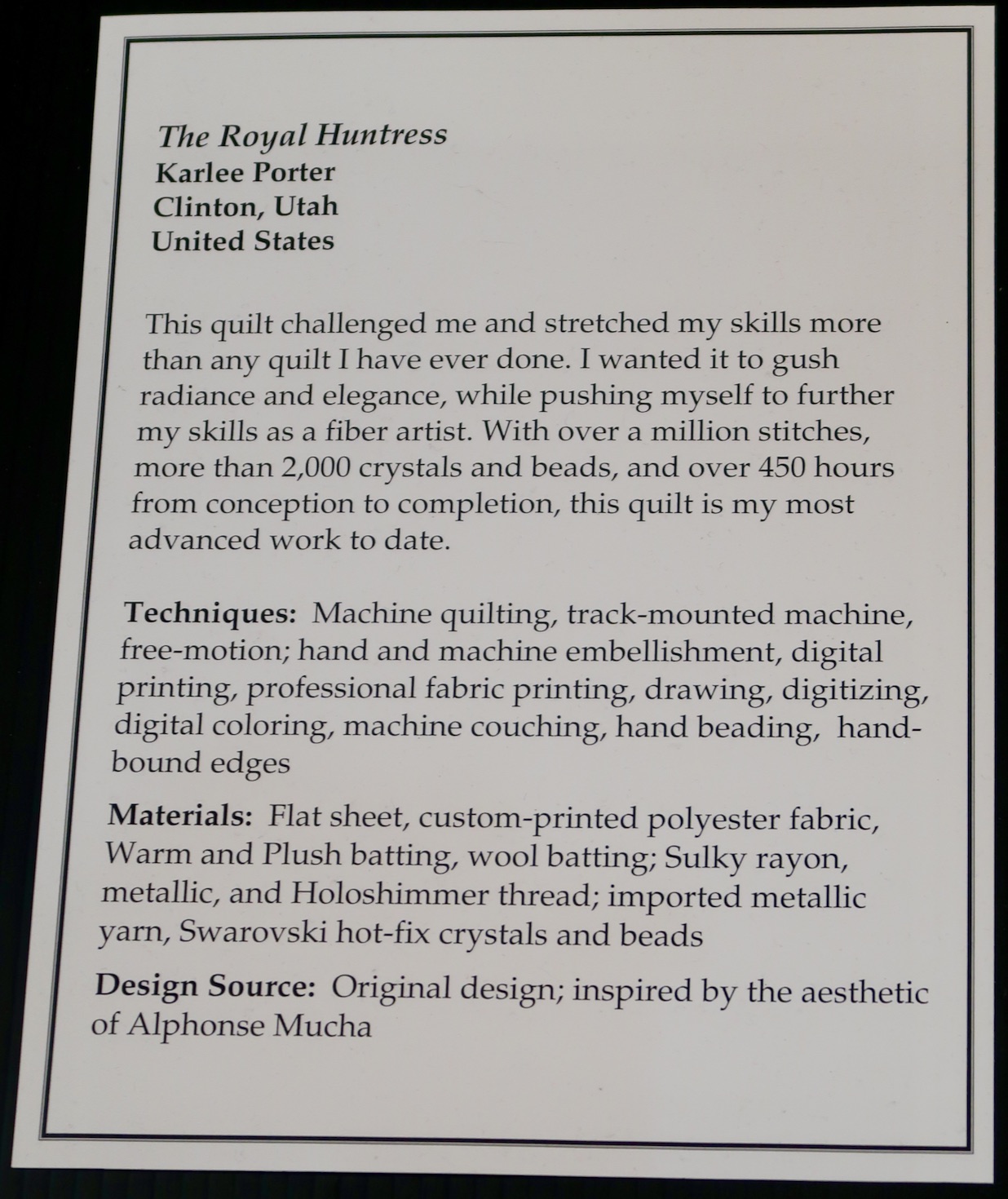 Karlee Porter's quilt, The Royal Huntress, challenged and stretched her skills. She wanted to push herself as a fiber artist and wanted the quilt to gush radiance and elegance. We think with over 1 million stitches, 2000 crystals and beads, and 450 hours of work, she achieved her goal. Did we mention this is a wholecloth quilt?