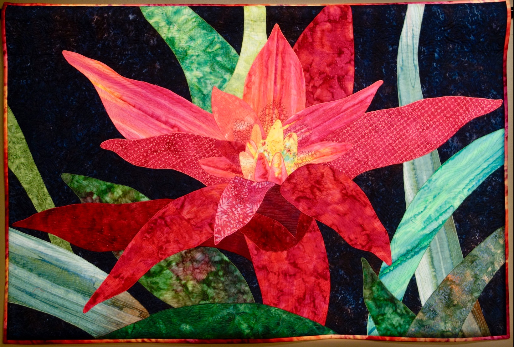 This beautiful Guzmania quilt is from a pattern by Kara Schorstein Peterson of Seams & Dreams. We had to look up what type of plant a Guzmania is and discovered it is an exotic flower (a Bromeliad) that can be found in many colors. This one, by Sue, is quite striking.