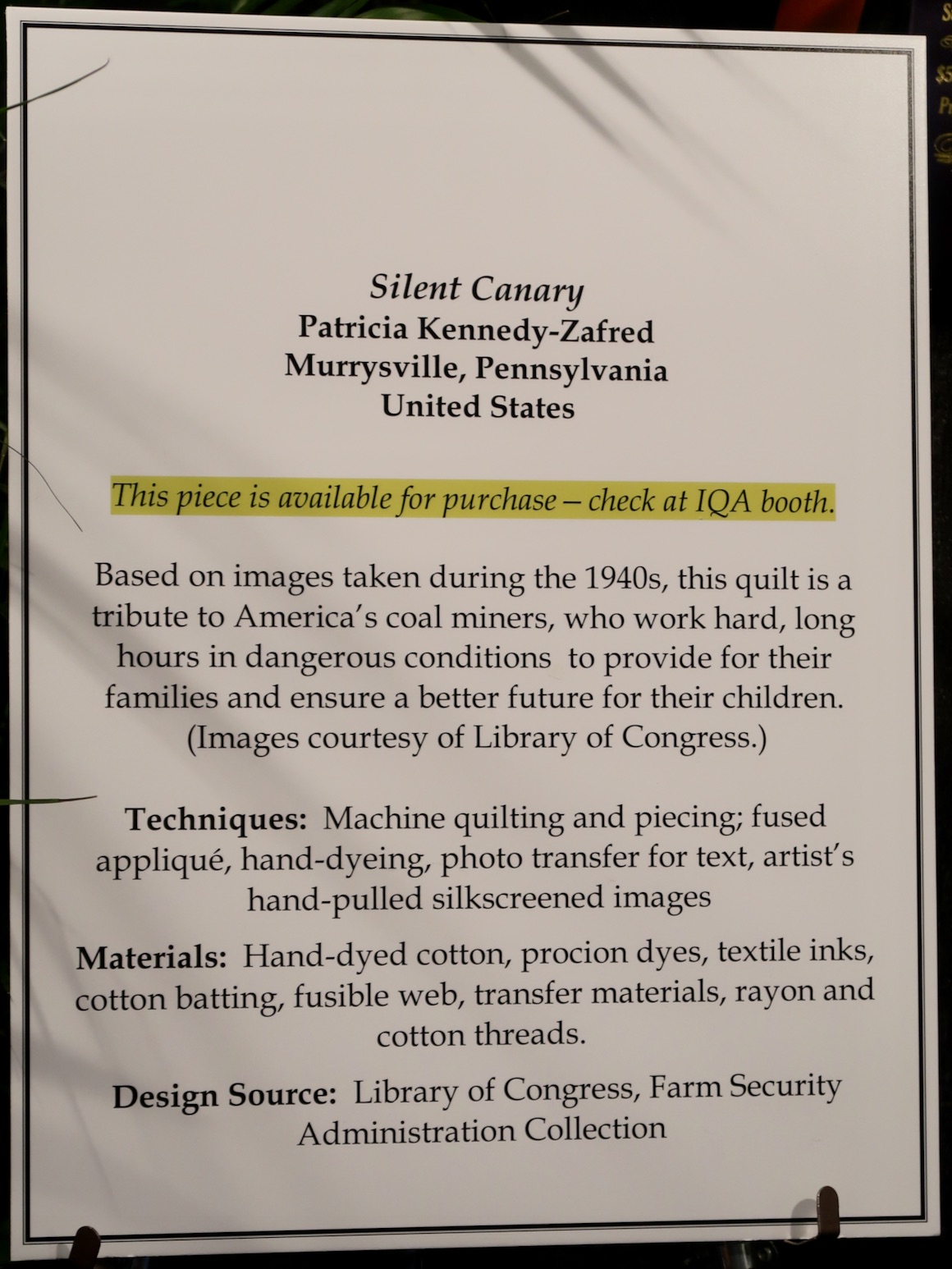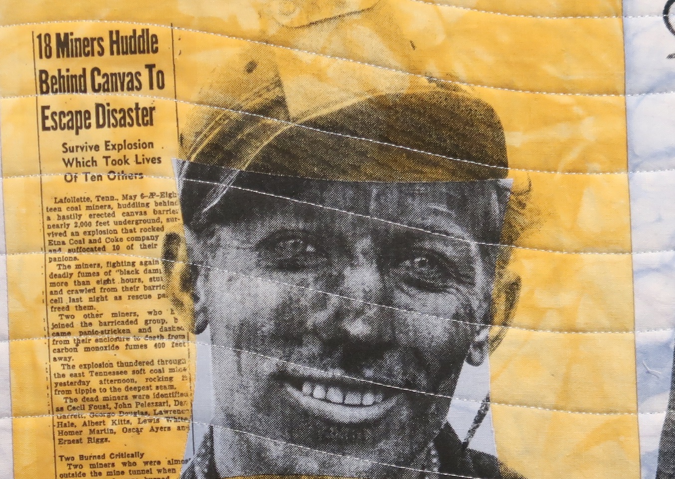 It's no wonder that this Top 8 Award-Winner from the Houston International Quilt Festival 2018 won the award for Innovative Artistry. Silent Canary is a tribute to America's coal miners. Patricia Kennedy-Zafred took an image from the Library of Congress and used multiple techniques and materials to create her work, including hand-dyed fabrics, photo transfers, silkscreen images, Procion dyes and more.